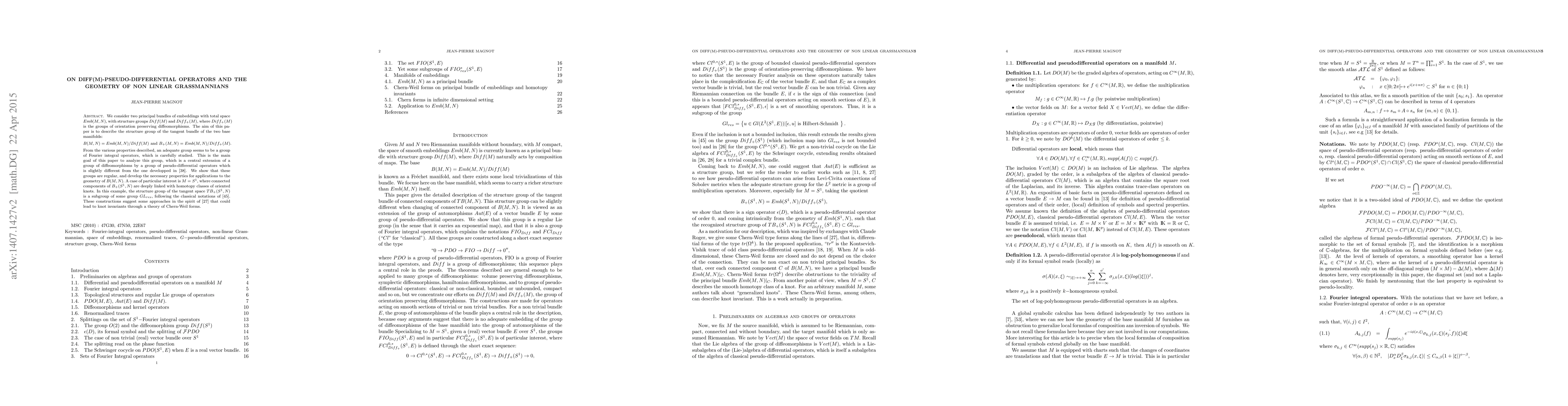 We consider two principal bundles of embeddings with total space $Emb(M,N),$ with structure groups $Diff(M)$ and $Diff_+(M),$ where $Diff_+(M)$ is the groups of orientation preserving diffeomorphisms. The aim of this paper is to describe the structure group of the tangent bundle of the two base manifolds: $$ B(M,N) = Emb(M,N)/Diff(M) \hbox{ and } B_+(M,N)= Emb(M,N)/Diff_+(M).$$ From the various properties described, an adequate group seems to be a group of Fourier integral operators, which is carefully studied. This is the main goal of this paper to analyze this group, which is a central extension of a group of diffeomorphisms by a group of pseudo-differential operators which is slightly different from the one developped in \cite{OMYK4}. We show that these groups are regular, and develop the necessary properties for applications to the geometry of $ B(M,N) .$ A case of particular interest is $M=S^1,$ where connected components of $B_+(S^1,N)$ are deeply linked with homotopy classes of oriented knots. In this example, the structure group of the tangent space $TB_+(S^1,N)$ is a subgroup of some group $GL_{res},$ following the classical notations of \cite{PS}. These constructions suggest some approaches in the spirit of \cite{Ma2006} that could lead to knot invariants through a theory of Chern-Weil forms.