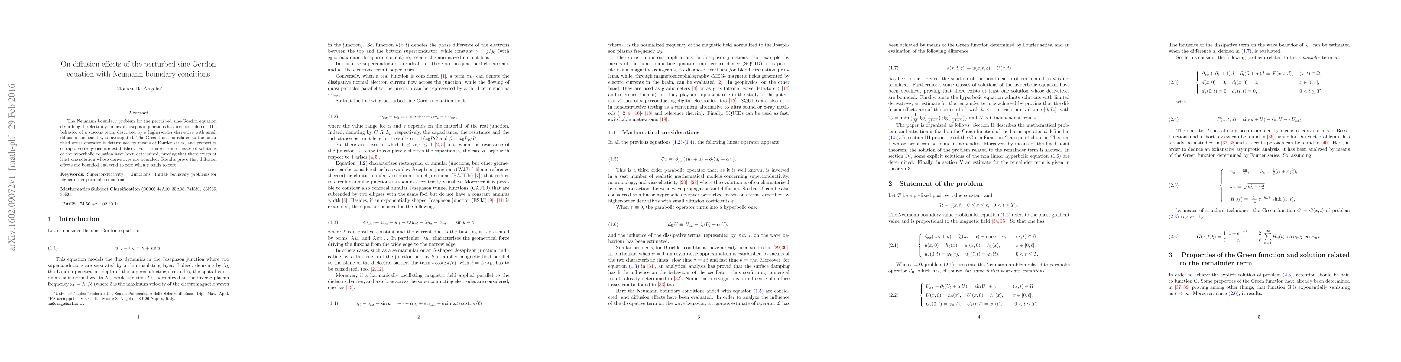The Neumann boundary problem for the perturbed sine-Gordon equation describing the electrodynamics of Josephson junctions has been considered. The behavior of a viscous term, described by a higher-order derivative with small diffusion coefficient, is investigated. The Green function related to the linear third order operator is determined by means of Fourier series, and properties of rapid convergence are established. Furthermore, some classes of solutions of the hyperbolic equation have been determined, proving that there exists at least one solution whose derivatives are bounded. Results prove that diffusion effects are bounded and tend to zero when the small diffusion coefficient tends to zero.