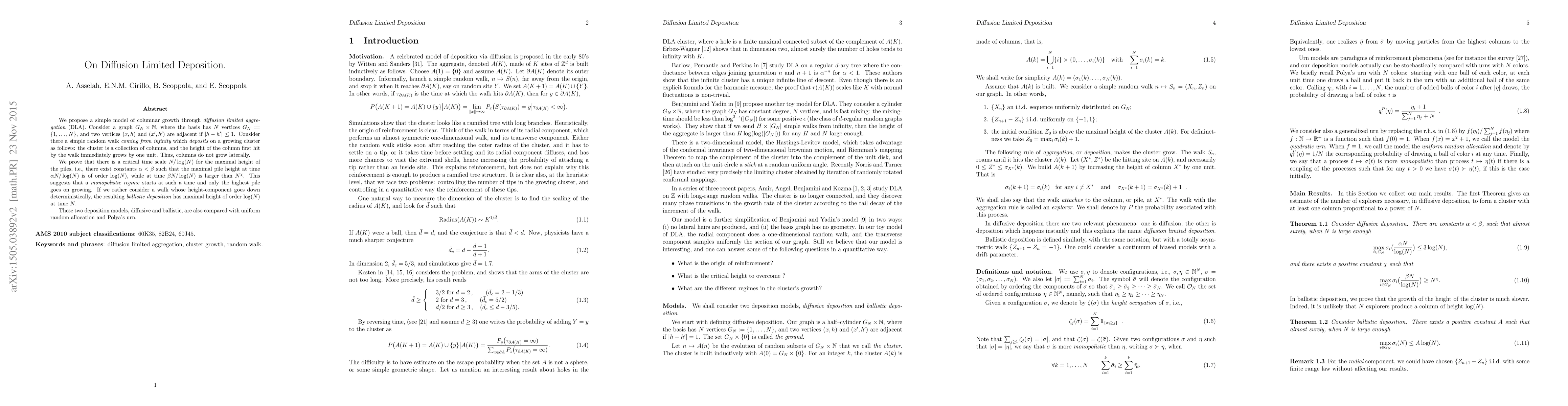 We propose a simple model of columnar growth through {\it diffusion limited aggregation} (DLA). Consider a graph $G_N\times\N$, where the basis has $N$ vertices $G_N:=\{1,\dots,N\}$, and two vertices $(x,h)$ and $(x',h')$ are adjacent if $|h-h'|\le 1$. Consider there a simple random walk {\it coming from infinity} which {\it deposits} on a growing cluster as follows: the cluster is a collection of columns, and the height of the column first hit by the walk immediately grows by one unit. Thus, columns do not grow laterally. We prove that there is a critical time scale $N/\log(N)$ for the maximal height of the piles, i.e., there exist constants $\alpha<\beta$ such that the maximal pile height at time $\alpha N/\log(N)$ is of order $\log(N)$, while at time $\beta N/\log(N)$ is larger than $N^\chi$. This suggests that a \emph{monopolistic regime} starts at such a time and only the highest pile goes on growing. If we rather consider a walk whose height-component goes down deterministically, the resulting \emph{ballistic deposition} has maximal height of order $\log(N)$ at time $N$. These two deposition models, diffusive and ballistic, are also compared with uniform random allocation and Polya's urn.