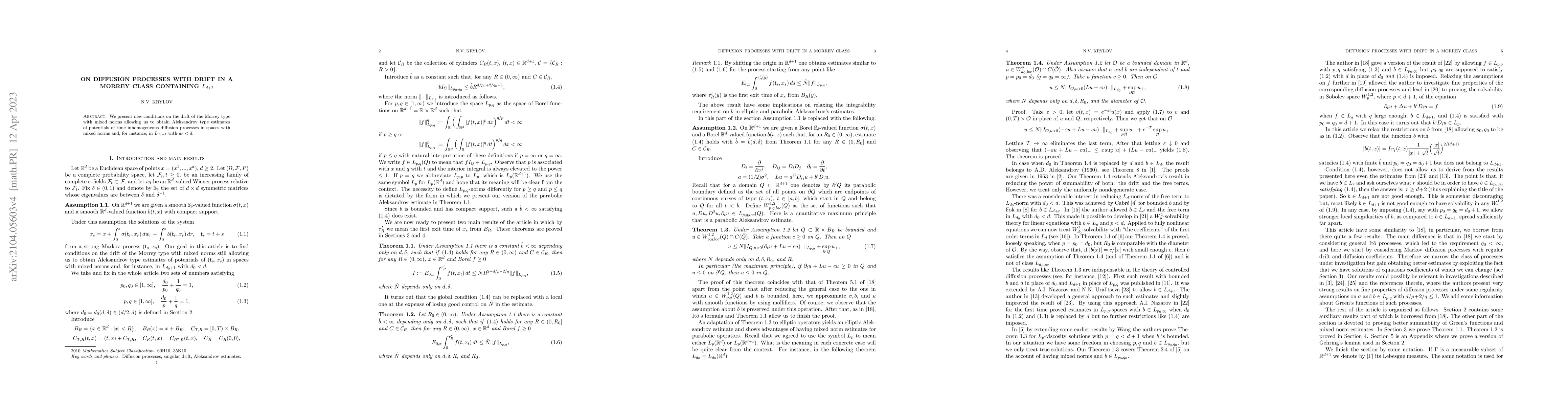 This paper introduces new conditions for the drift in Morrey spaces with mixed norms to derive Aleksandrov-type estimates for potentials of time-inhomogeneous diffusion processes, particularly in $L_{d_{0}+1}$ spaces where $d_{0}<d$.