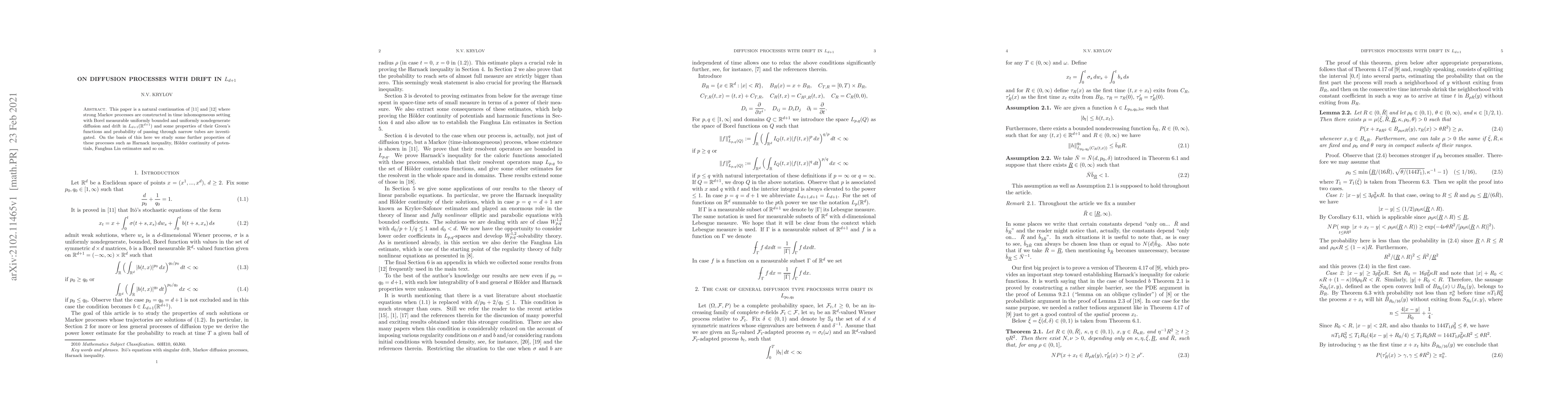 This paper is a natural continuation of \cite{Kr_20_2} and \cite{Kr_21_1} where strong Markov processes are constructed in time inhomogeneous setting with Borel measurable uniformly bounded and uniformly nondegenerate diffusion and drift in $L_{d+1}(\mathbb{R}^{d+1})$ and some properties of their Green's functions and probability of passing through narrow tubes are investigated. On the basis of this here we study some further properties of these processes such as Harnack inequality, H\"older continuity of potentials, Fanghua Lin estimates and so on.
