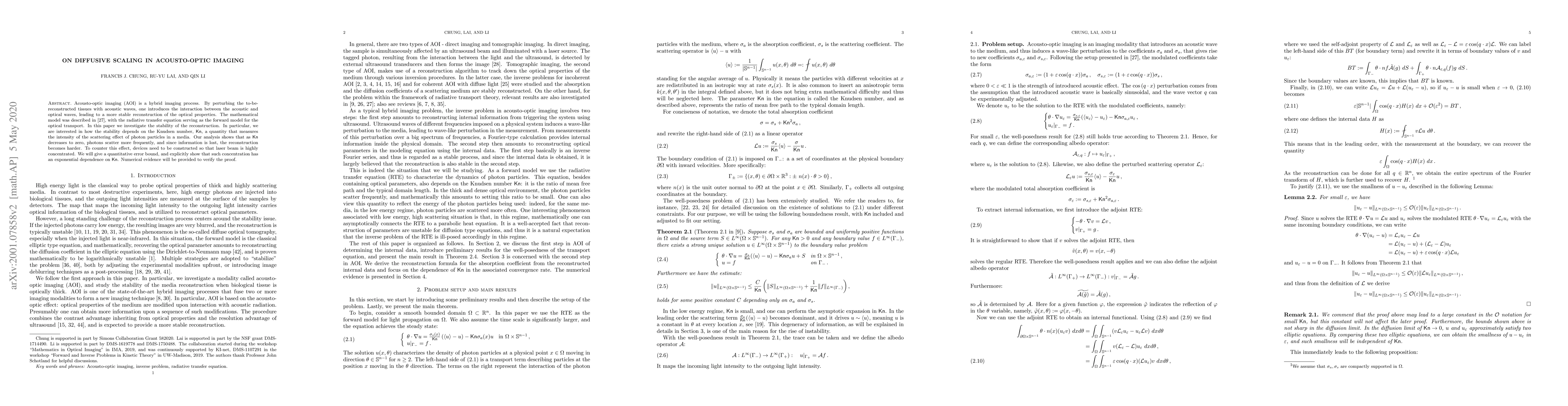 Acousto-optic imaging (AOI) is a hybrid imaging process. By perturbing the to-be-reconstructed tissues with acoustic waves, one introduces the interaction between the acoustic and optical waves, leading to a more stable reconstruction of the optical properties. The mathematical model was described in [25], with the radiative transfer equation serving as the forward model for the optical transport. In this paper we investigate the stability of the reconstruction. In particular, we are interested in how the stability depends on the Knudsen number, Kn, a quantity that measures the intensity of the scattering effect of photon particles in a media. Our analysis shows that as Kn decreases to zero, photons scatter more frequently, and since information is lost, the reconstruction becomes harder. To counter this effect, devices need to be constructed so that laser beam is highly concentrated. We will give a quantitative error bound, and explicitly show that such concentration has an exponential dependence on Kn. Numerical evidence will be provided to verify the proof.