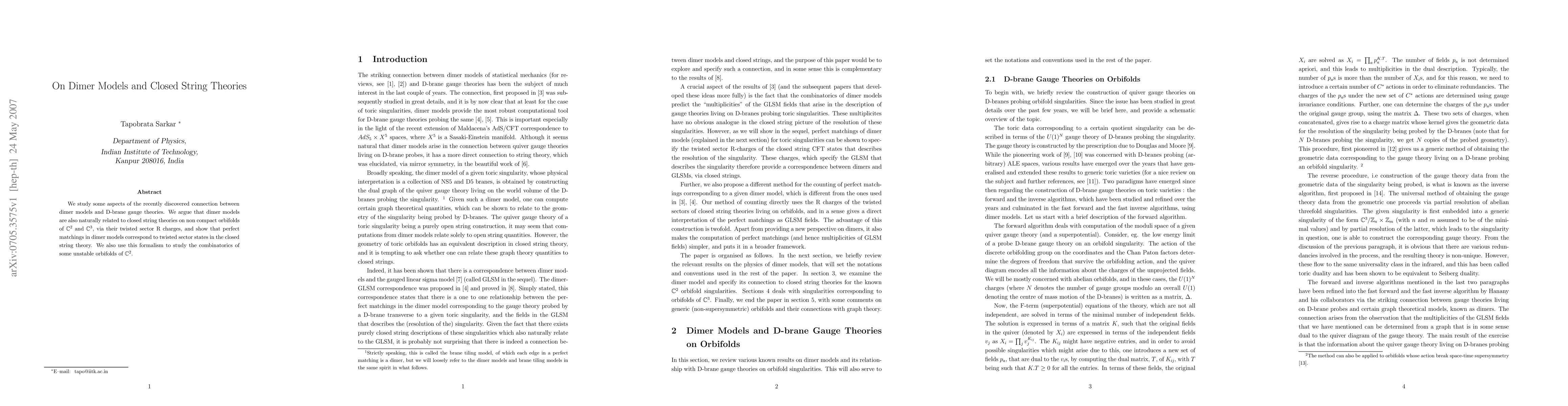 This paper explores the link between dimer models and D-brane gauge theories, demonstrating their connection to closed string theories on non-compact orbifolds of $\BC^2$ and $\BC^3$ through twisted sector R charges. It establishes that perfect matchings in dimer models correspond to twisted sector states in closed string theory, and applies this framework to analyze the combinatorics of unstable orbifolds of $\BC^2$.