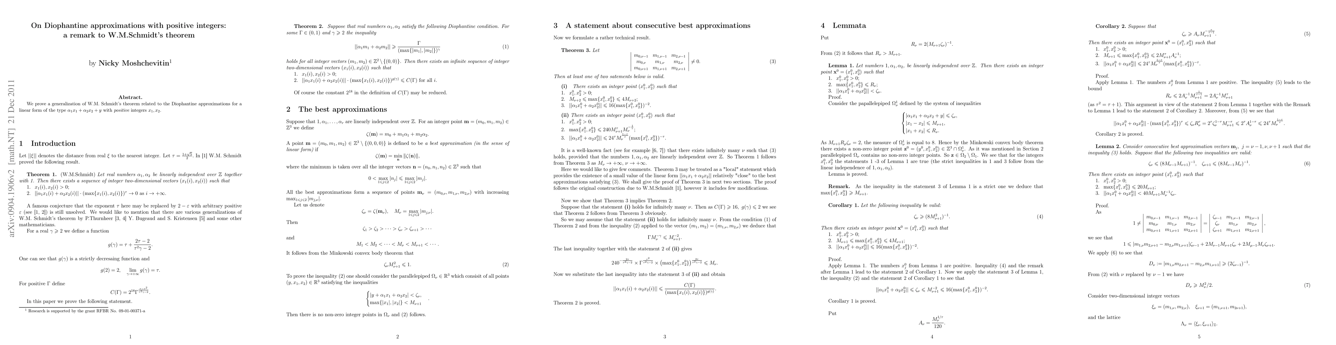 Summary: This paper generalizes W.M. Schmidt's theorem to address Diophantine approximations involving a linear form with positive integer coefficients and variables. The focus is on the specific case where the linear form is of the type $\alpha_1x_1+\alpha_2x_2 + y$.