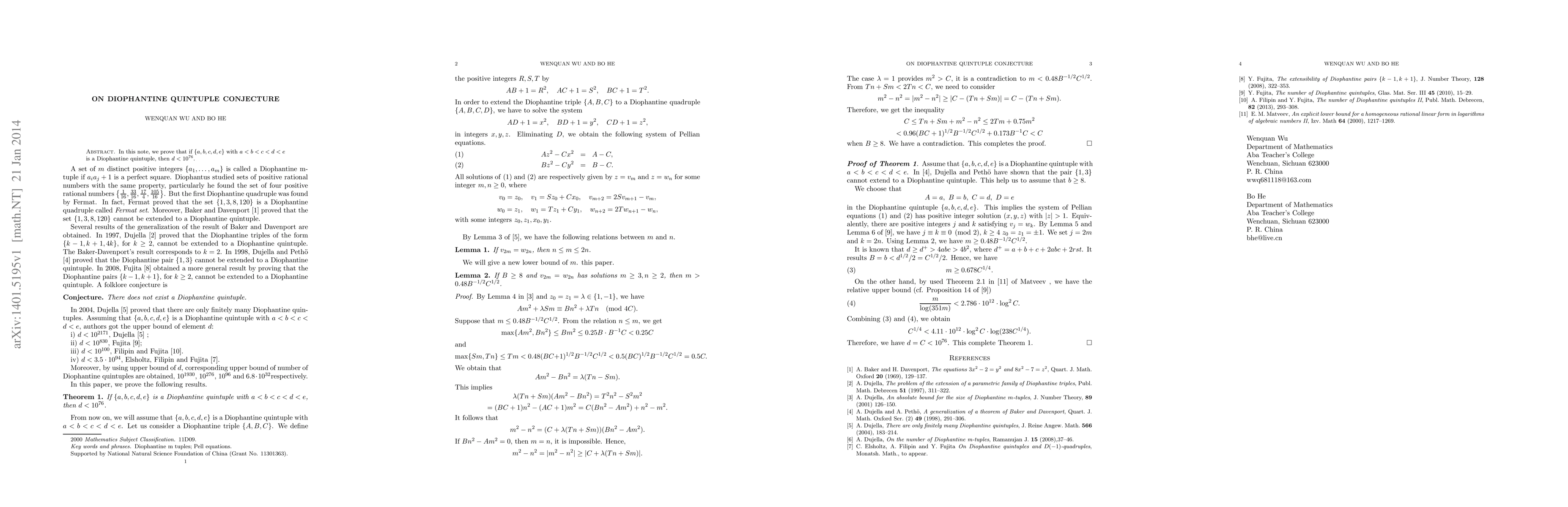 Summary: This paper proves that any Diophantine quintuple $\{a,b,c,d,e\}$ with $a<b<c<d<e$ satisfies the inequality $d<10^{76}$. The result provides a significant upper bound for the largest element in such quintuples.