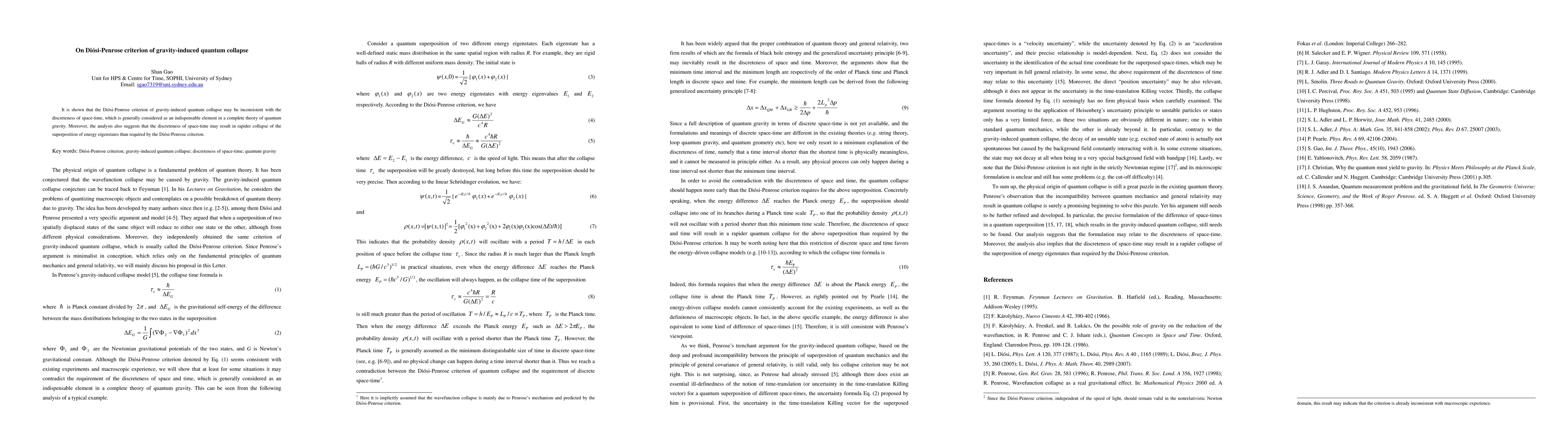 A study suggests that the Diosi-Penrose criterion for gravity-induced quantum collapse may be inconsistent with the discreteness of space-time, potentially leading to faster-than-required superposition collapses.