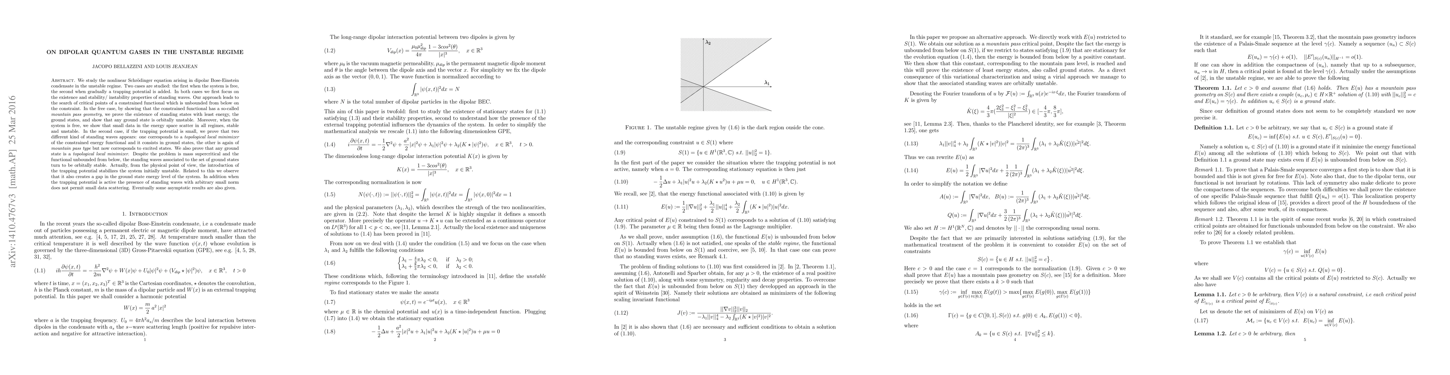 We study the nonlinear Schr\"odinger equation arising in dipolar Bose-Einstein condensate in the unstable regime. Two cases are studied: the first when the system is free, the second when gradually a trapping potential is added. In both cases we first focus on the existence and stability/ instability properties of standing waves. Our approach leads to the search of critical points of a constrained functional which is unbounded from below on the constraint. In the free case, by showing that the constrained functional has a so-called {\it mountain pass geometry}, we prove the existence of standing states with least energy, the ground states, and show that any ground state is orbitally unstable. Moreover, when the system is free, we show that small data in the energy space scatter in all regimes, stable and unstable. In the second case, if the trapping potential is small, we prove that two different kind of standing waves appears: one corresponds to a {\it topological local minimizer} of the constrained energy functional and it consists in ground states, the other is again of {\it mountain pass type} but now corresponds to excited states. We also prove that any ground state is a {\it topological local minimizer}. Despite the problem is mass supercritical and the functional unbounded from below, the standing waves associated to the set of ground states turn to be orbitally stable. Actually, from the physical point of view, the introduction of the trapping potential stabilizes the system initially unstable. Related to this we observe that it also creates a gap in the ground state energy level of the system. In addition when the trapping potential is active the presence of standing waves with arbitrary small norm does not permit small data scattering. Eventually some asymptotic results are also given.