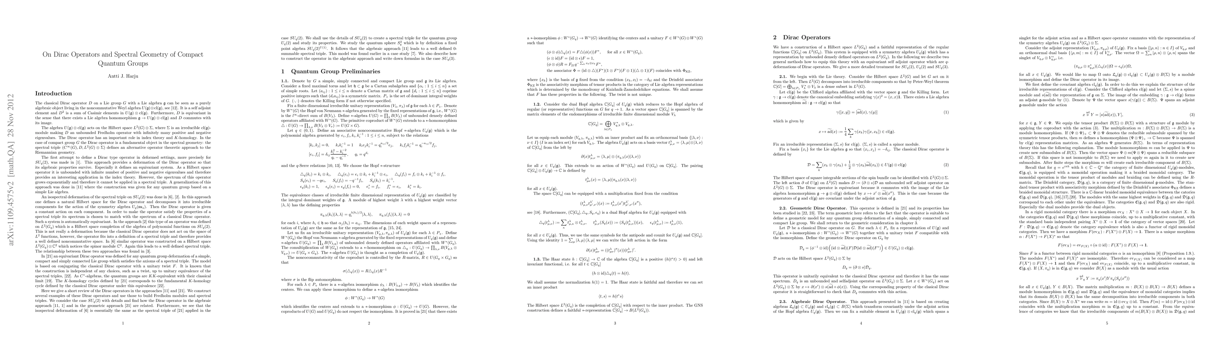 Recent progress to construct Dirac operators and spinors on compact quantum groups is discussed. The case $SU_q(2)$ is studied carefully and the relationship between known approaches is explained. New examples are given.