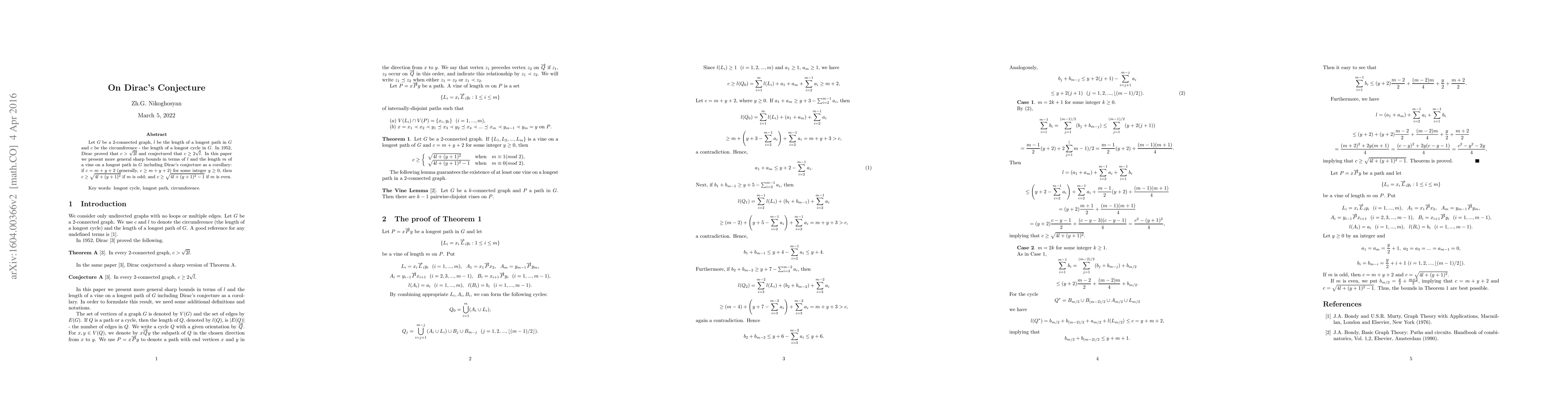 Let $G$ be a 2-connected graph, $l$ be the length of a longest path in $G$ and $c$ be the circumference - the length of a longest cycle in $G$. In 1952, Dirac proved that $c>\sqrt{2l}$ and conjectured that $c\ge 2\sqrt{l}$. In this paper we present more general sharp bounds in terms of $l$ and the length $m$ of a vine on a longest path in $G$ including Dirac's conjecture as a corollary: if $c=m+y+2$ (generally, $c\ge m+y+2$) for some integer $y\ge 0$, then $c\ge\sqrt{4l+(y+1)^2}$ if $m$ is odd; and $c\ge\sqrt{4l+(y+1)^2-1}$ if $m$ is even.