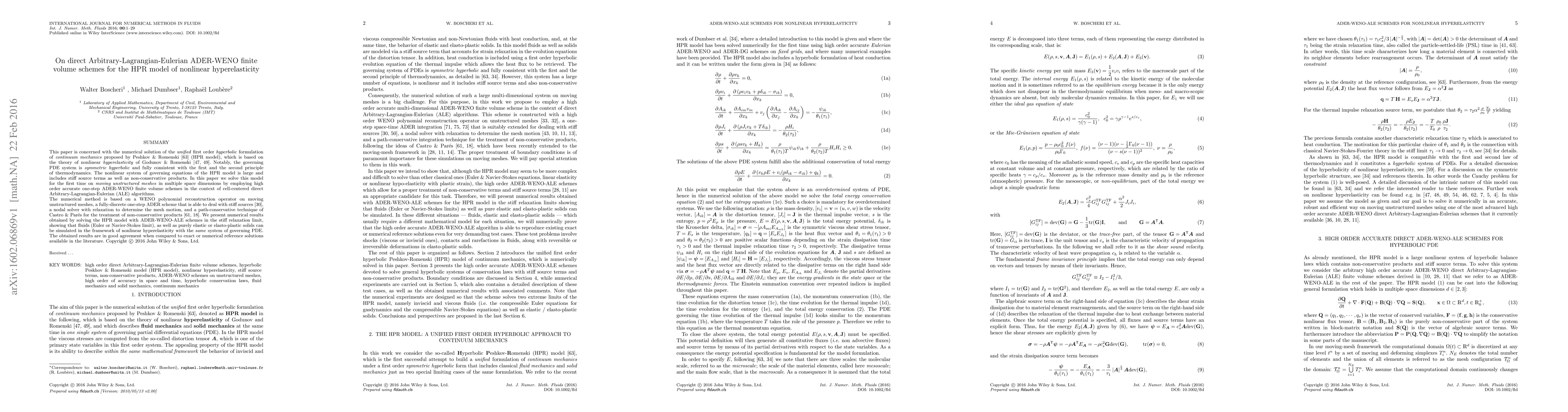 This paper introduces high-order ADER-WENO finite volume schemes for solving the HPR model of nonlinear hyperelasticity on moving unstructured meshes using ALE methods. The proposed method effectively handles stiff sources and non-conservative products, demonstrating accurate simulation of fluids and elastic solids within the same PDE framework.