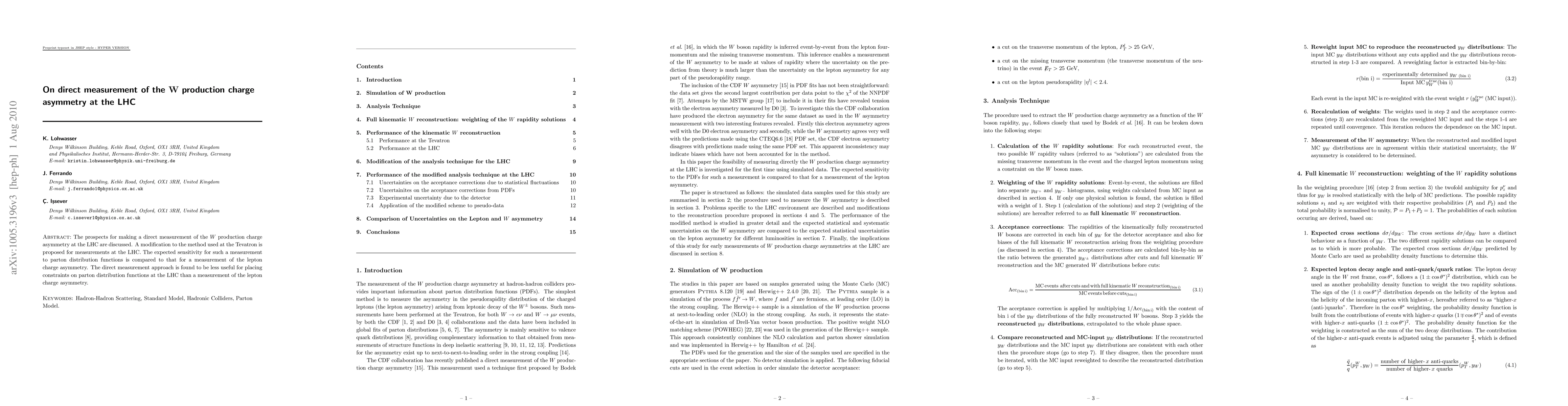 This paper discusses the feasibility of directly measuring the W production charge asymmetry at the LHC, proposing a modified method from the Tevatron. It concludes that this direct measurement is less effective for constraining parton distribution functions compared to measuring the lepton charge asymmetry.