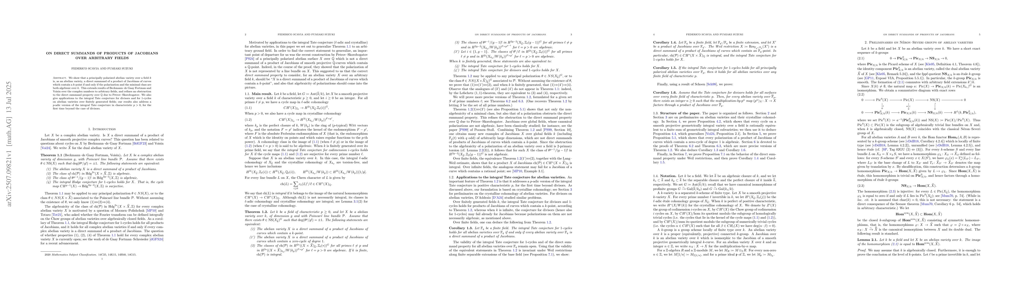 We show that a principally polarized abelian variety over a field $k$ is, as an abelian variety, a direct summand of a product of Jacobians of curves which contain a $k$-point if and only if the polarization and the minimal class are both algebraic over $k$. This extends results of Beckmann--de Gaay Fortman and Voisin over the complex numbers to arbitrary fields, and refines an obstruction to the direct summand property over $\mathbb{Q}$ due to Petrov--Skorobogatov. We also give applications to the integral Tate conjecture for divisors and for $1$-cycles on abelian varieties over finitely generated fields; our results also address a $p$-adic version of the integral Tate conjecture in characteristic $p>0$, for the first time beyond the case of divisors.