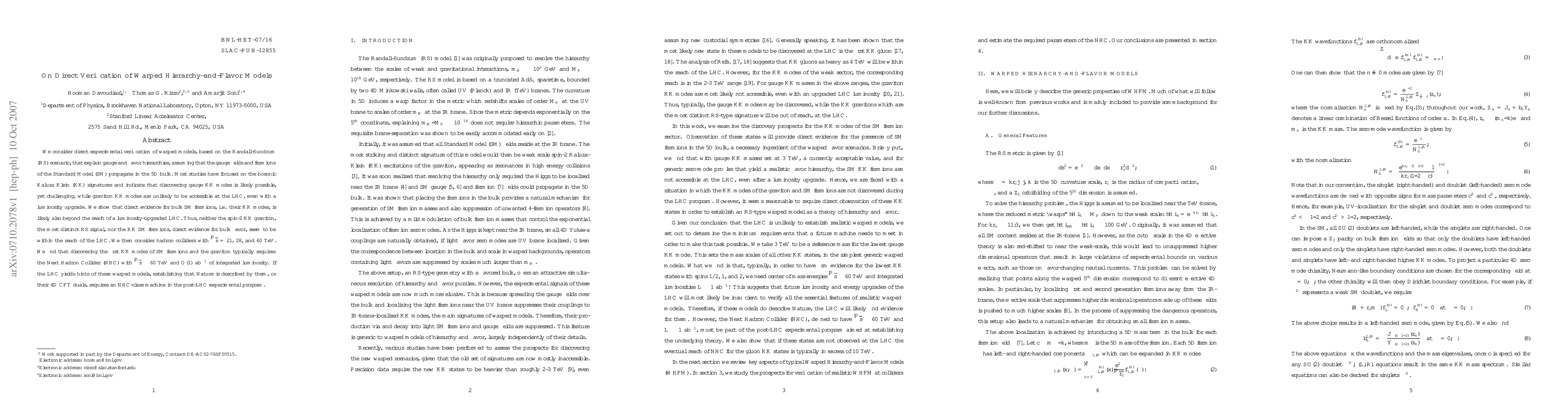 We consider direct experimental verification of warped models, based on the Randall-Sundrum (RS) scenario, that explain gauge and flavor hierarchies, assuming that the gauge fields and fermions of the Standard Model (SM) propagate in the 5D bulk. Most studies have focused on the bosonic Kaluza Klein (KK) signatures and indicate that discovering gauge KK modes is likely possible, yet challenging, while graviton KK modes are unlikely to be accessible at the LHC, even with a luminosity upgrade. We show that direct evidence for bulk SM fermions, {\it i.e.} their KK modes, is likely also beyond the reach of a luminosity-upgraded LHC. Thus, neither the spin-2 KK graviton, the most distinct RS signal, nor the KK SM fermions, direct evidence for bulk flavor, seem to be within the reach of the LHC. We then consider hadron colliders with $\sqrt{s} =$ 21, 28, and 60 TeV. We find that discovering the first KK modes of SM fermions and the graviton typically requires the Next Hadron Collider (NHC) with $\sqrt{s} \approx 60$ TeV and ${\cal O}(1)$ ab$^{-1}$ of integrated luminosity. If the LHC yields hints of these warped models, establishing that Nature is described by them, or their 4D CFT duals, requires an NHC-class machine in the post-LHC experimental program.