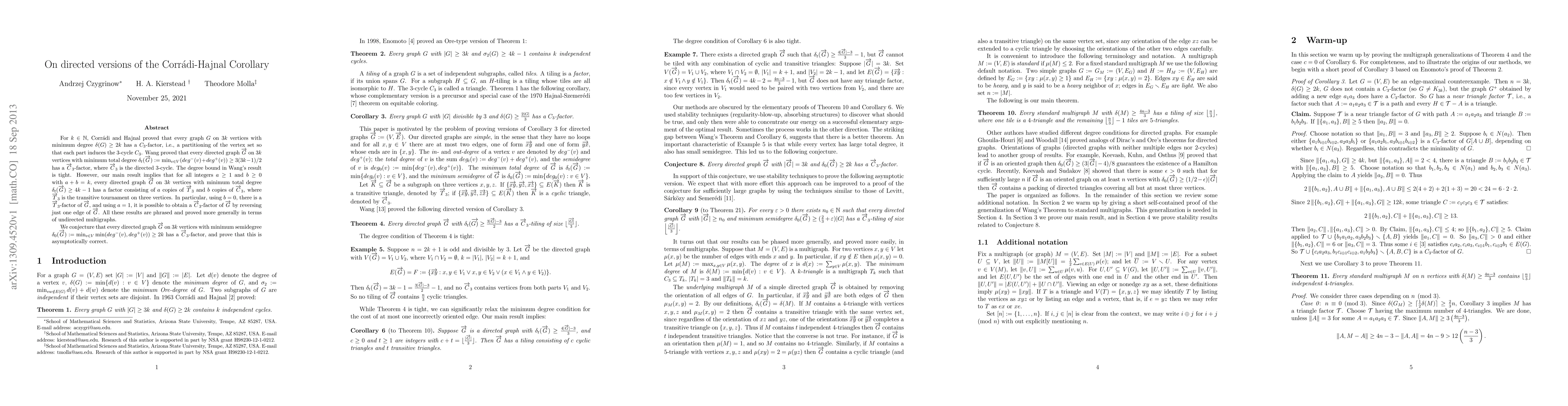 This paper extends the Corr\'adi-Hajnal Corollary to directed graphs, proving that for $3k$ vertices with minimum total degree $\delta_t(\overrightarrow G)\ge 4k-1$, the graph has a factor consisting of $a$ copies of $\overrightarrow T_3$ and $b$ copies of $\overrightarrow C_3$. The authors also conjecture that a $\overrightarrow C_3$-factor exists for directed graphs with minimum semidegree $\delta_0(\overrightarrow G) \ge 2k$, proving its asymptotic correctness.