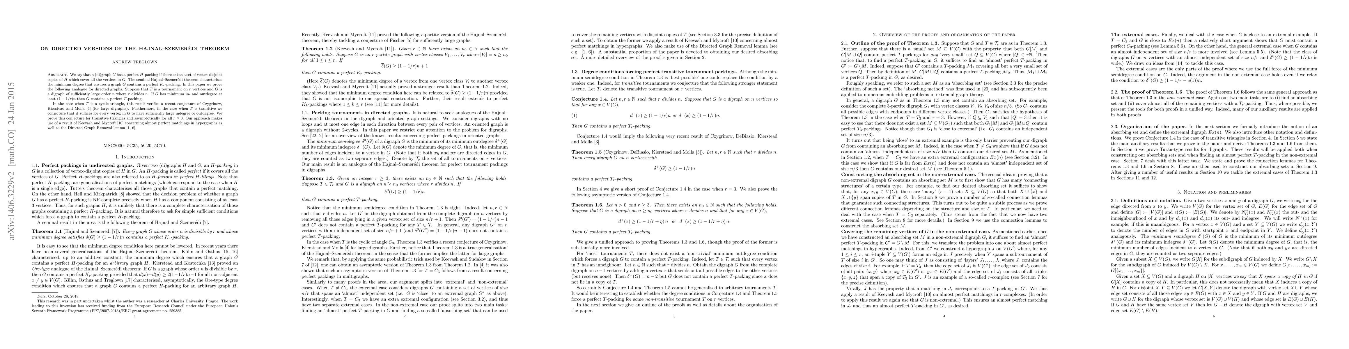 This paper proves a directed analogue of the Hajnal-Szemerédi theorem, showing that a sufficiently large digraph with minimum in- and outdegree at least $(1-1/r)n$ contains a perfect $T$-packing for any tournament $T$ on $r$ vertices, verifying a conjecture for cyclic triangles and proving a related conjecture for transitive triangles.