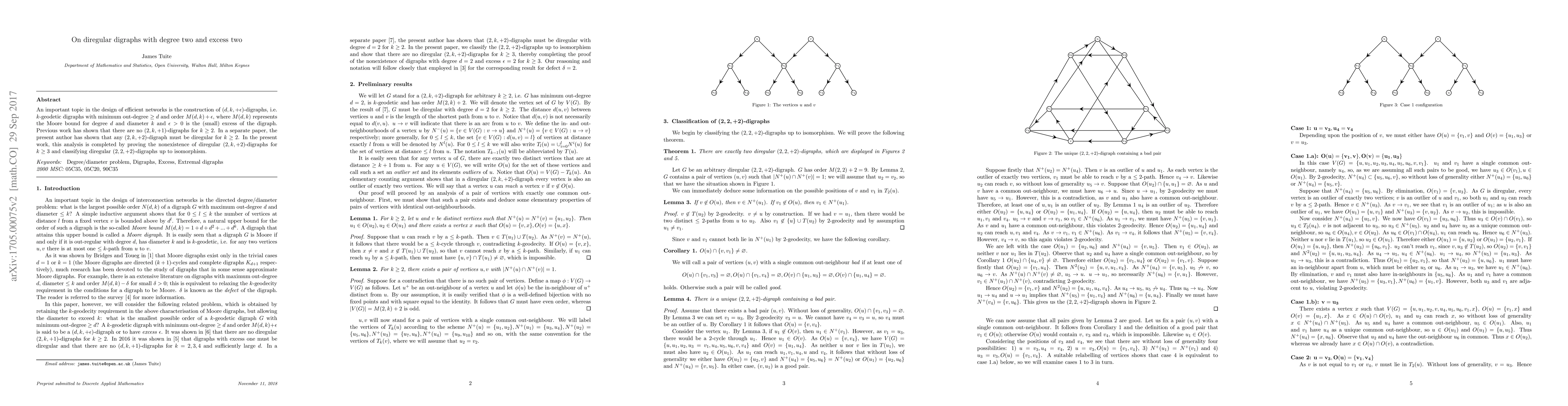 The development of a novel algorithm for detecting digraphs with degree two and excess one, which has significant implications for the study of directed graphs
