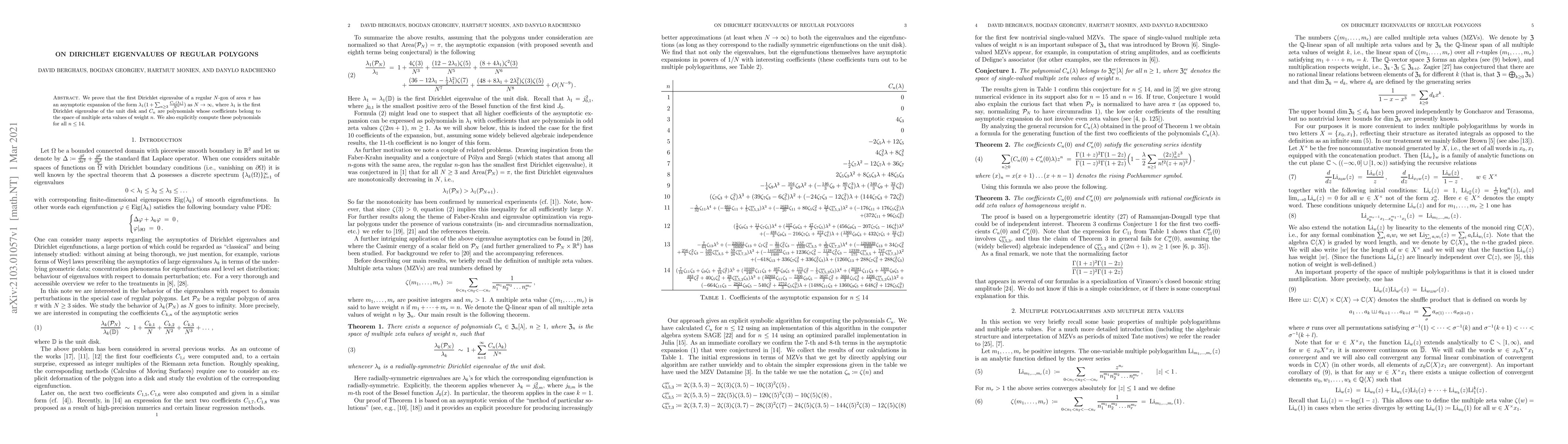 This paper proves the asymptotic expansion of the first Dirichlet eigenvalue for a regular $N$-gon of area $\pi$ as $N$ approaches infinity, showing it converges to $\lambda_1(1+\sum_{n\ge3}C_n(\lambda_1)N^{-n})$, where $\lambda_1$ is the first eigenvalue of the unit disk and $C_n$ are polynomials linked to multiple zeta values. The polynomials are explicitly computed up to $n=14$.