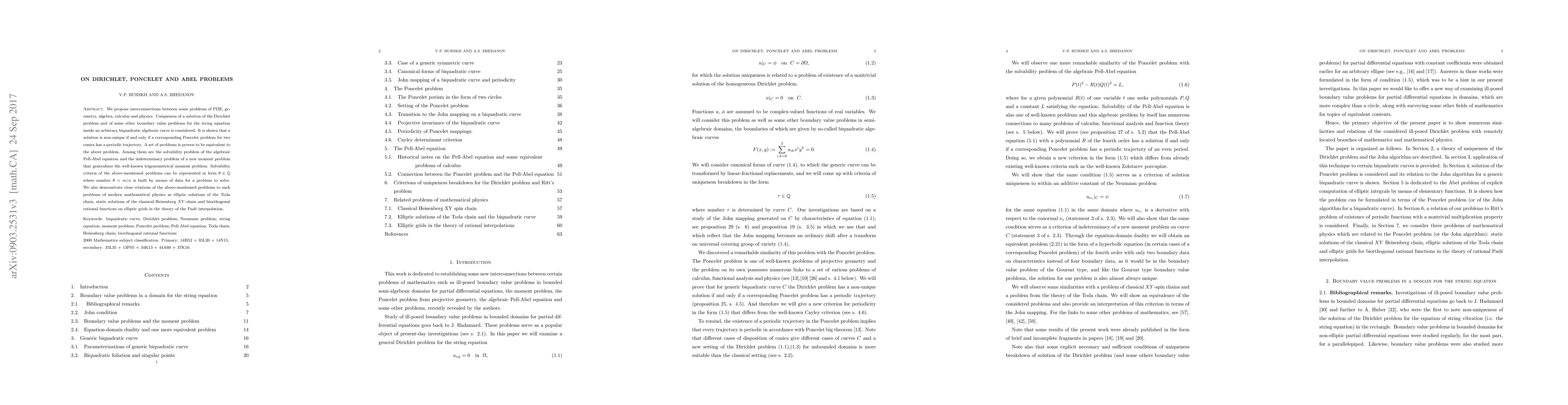We propose interconnections between some problems of PDE, geometry, algebra, calculus and physics. Uniqueness of a solution of the Dirichlet problem and of some other boundary value problems for the string equation inside an arbitrary biquadratic algebraic curve is considered. It is shown that a solution is non-unique if and only if a corresponding Poncelet problem for two conics has a periodic trajectory. A set of problems is proven to be equivalent to the above problem. Among them are the solvability problem of the algebraic Pell-Abel equation and the indeterminacy problem of a new moment problem that generalizes the well-known trigonometrical moment problem. Solvability criteria of the above-mentioned problems can be represented in form $\theta\in\Bbb Q$ where number $\theta=m/n$ is built by means of data for a problem to solve. We also demonstrate close relations of the above-mentioned problems to such problems of modern mathematical physics as elliptic solutions of the Toda chain, static solutions of the classical Heisenberg $XY$-chain and biorthogonal rational functions on elliptic grids in the theory of the Pad\'e interpolation.