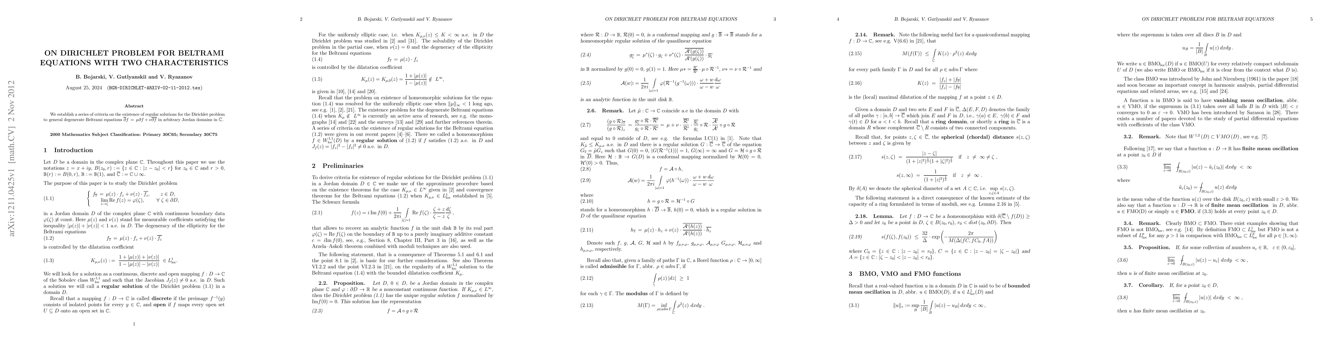 Summary: This paper establishes criteria for the existence of regular solutions for the Dirichlet problem of general degenerate Beltrami equations in arbitrary Jordan domains in the complex plane. The focus is on the equation ${\bar{\partial}}f = \mu {\partial f}+\nu {\bar{\partial f}}$.