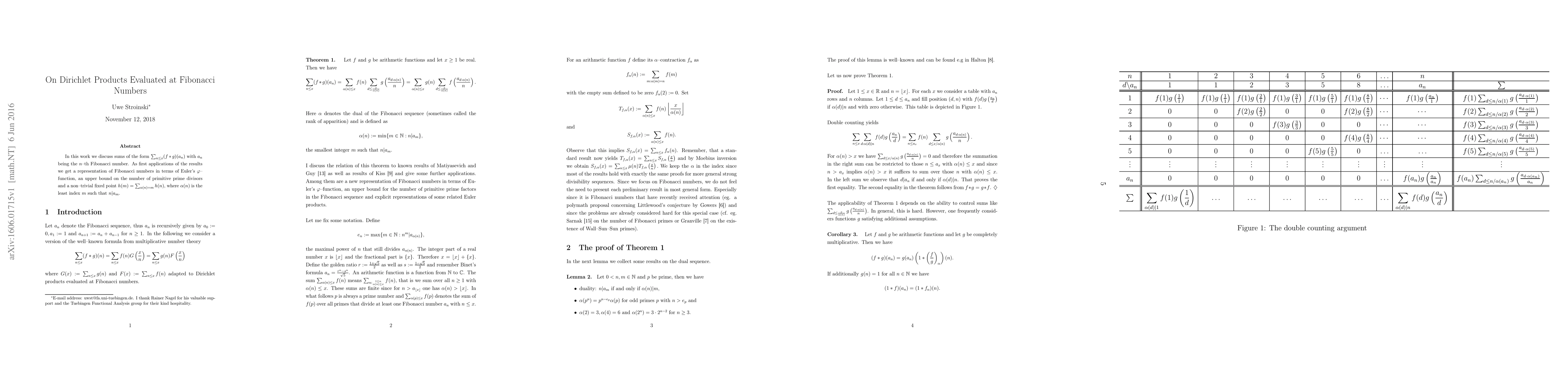 This paper explores Dirichlet products evaluated at Fibonacci numbers, deriving representations of Fibonacci numbers using Euler's totient function and establishing bounds on the number of primitive prime divisors. It also investigates related Euler products and sums functions over primitive divisors of Fibonacci numbers.