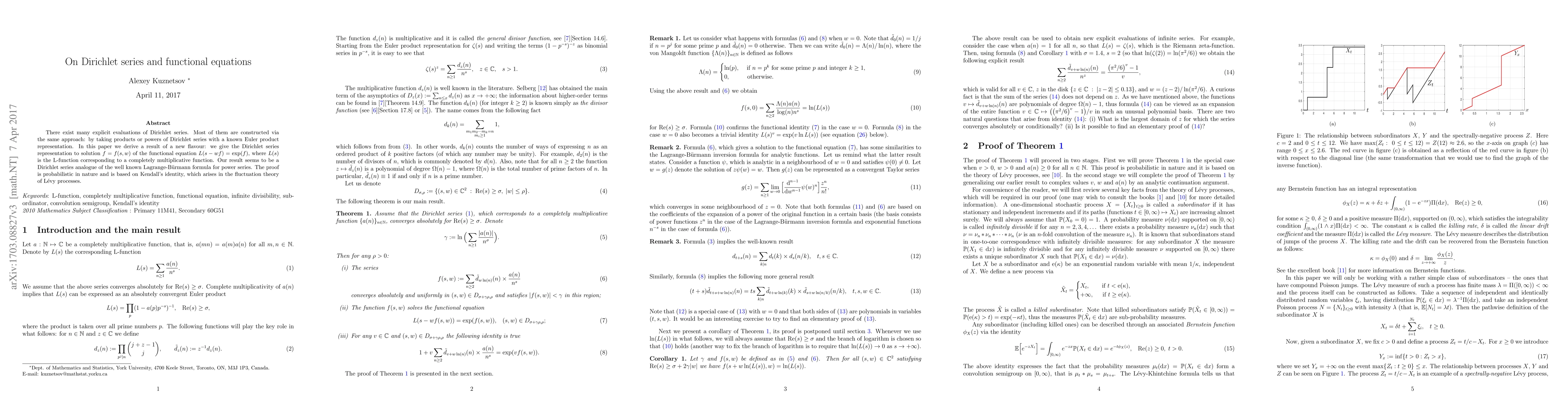 This paper introduces a novel Dirichlet series representation for solutions to the functional equation \(L(s-wf) = \exp(f)\), analogous to the Lagrange-Bürmann formula for power series. The proof leverages probabilistic methods and Kendall's identity from the fluctuation theory of Lévy processes.