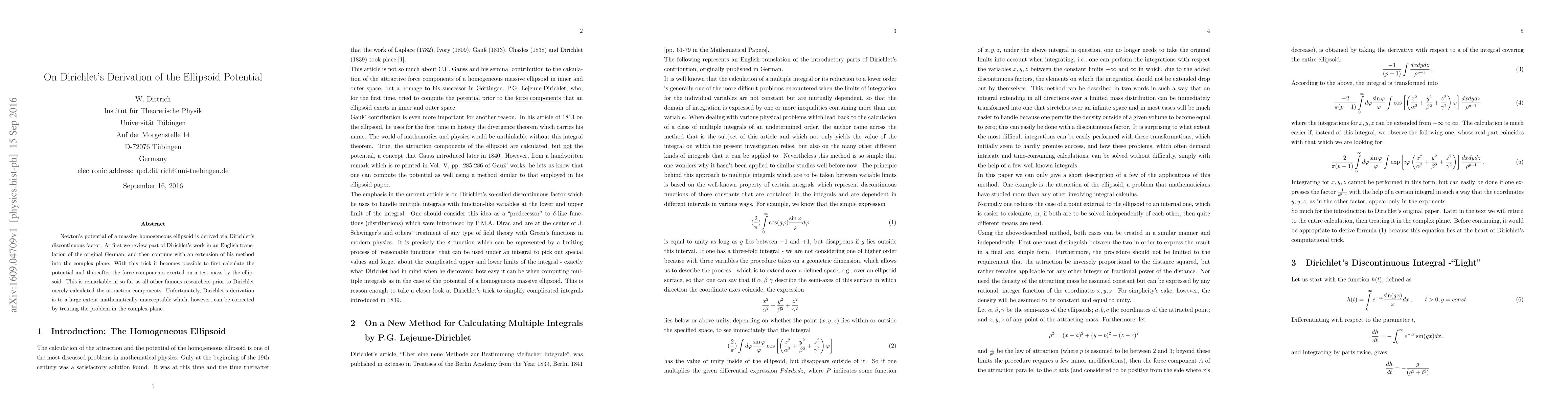 Newton's potential of a massive homogeneous ellipsoid is derived via Dirichlet's discontinuous factor. At first we review part of Dirichlet's work in an English translation of the original German, and then continue with an extension of his method into the complex plane. With this trick it becomes possible to first calculate the potential and thereafter the force components exerted on a test mass by the ellipsoid. This is remarkable in so far as all other famous researchers prior to Dirichlet merely calculated the attraction components. Unfortunately, Dirichlet's derivation is to a large extent mathematically unacceptable which, however, can be corrected by treating the problem in the complex plane.