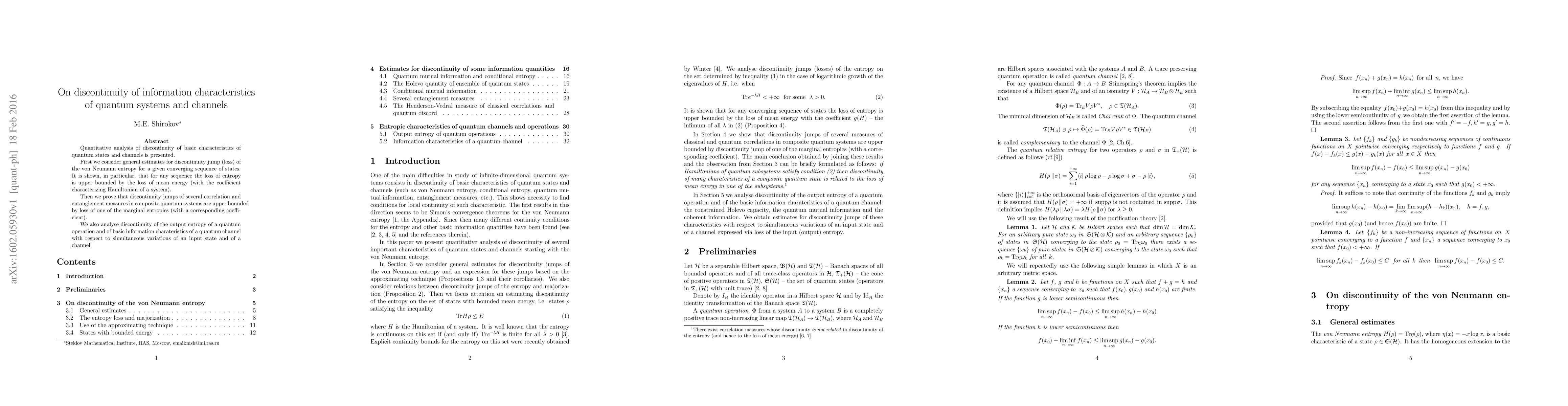 Quantitative analysis of discontinuity of basic characteristics of quantum states and channels is presented. First we consider general estimates for discontinuity jump (loss) of the von Neumann entropy for a given converging sequence of states. It is shown, in particular, that for any sequence the loss of entropy is upper bounded by the loss of mean energy (with the coefficient characterizing Hamiltonian of a system). Then we prove that discontinuity jumps of several correlation and entanglement measures in composite quantum systems are upper bounded by loss of one of the marginal entropies (with a corresponding coefficient). We also analyse discontinuity of the output entropy of a quantum operation and of basic information charateristics of a quantum channel with respect to simultaneous variations of an input state and of a channel.