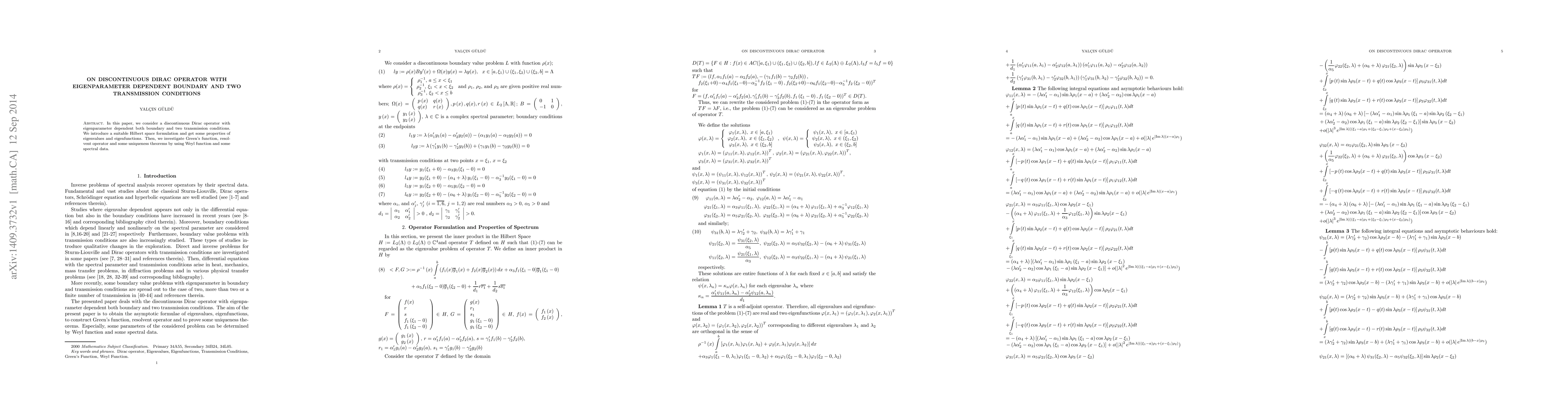 In this paper, we consider a discontinuous Dirac operator with eigenparameter dependent both boundary and two transmission conditions. We introduce a suitable Hilbert space formulation and get some properties of eigenvalues and eigenfunctions. Then, we investigate Green's function, resolvent operator and some uniqueness theorems by using Weyl function and some spectral data.