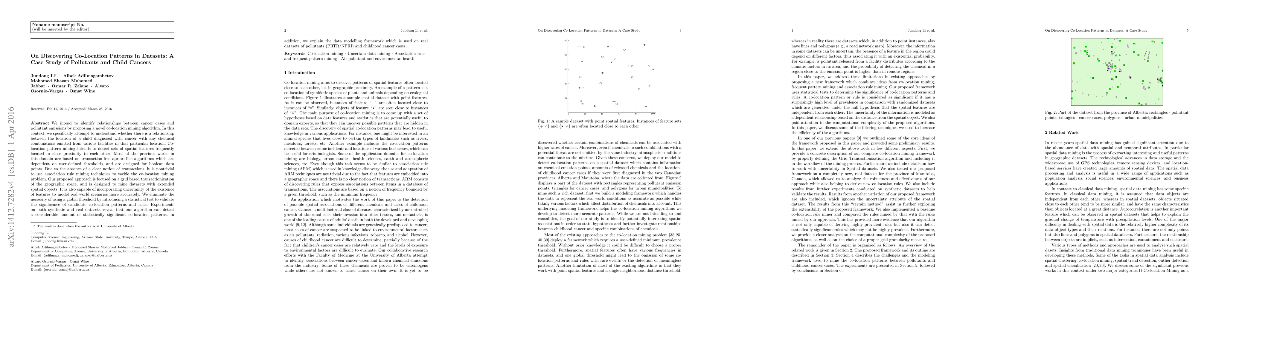 This research paper explores co-location patterns between pollutant emissions and childhood cancer cases using a novel approach to spatial data mining that considers uncertainty and statistical significance.