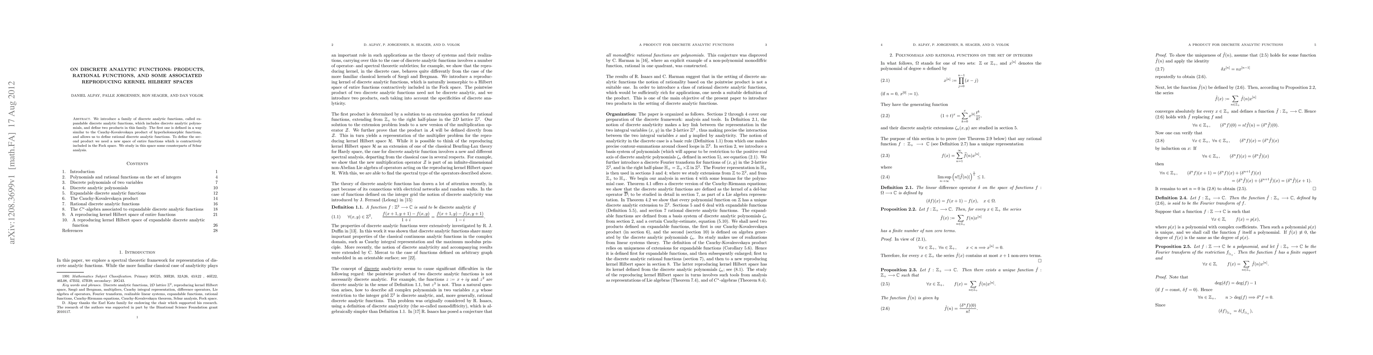 The paper introduces expandable discrete analytic functions and defines two products within this family, including a counterpart to Schur analysis in a new space of entire functions contractively included in the Fock space.