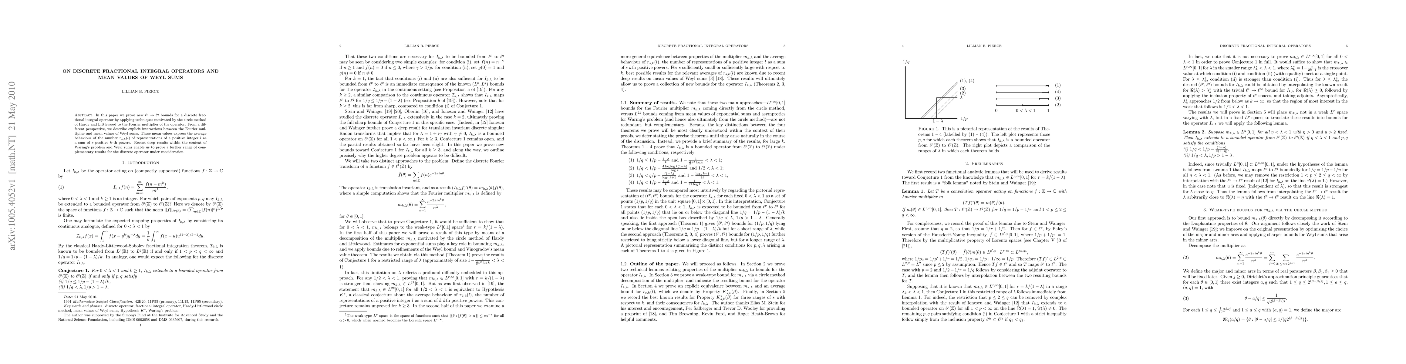 In this paper we prove new $(\ell^p, \ell^q)$ bounds for a discrete fractional integral operator by applying techniques motivated by the circle method of Hardy and Littlewood to the Fourier multiplier of the operator. From a different perspective, we describe explicit interactions between the Fourier multiplier and mean values of Weyl sums. These mean values express the average behaviour of the number $r_{s,k}(l)$ of representations of a positive integer $l$ as a sum of $s$ positive $k$-th powers. Recent deep results within the context of Waring's problem and Weyl sums enable us to prove a further range of complementary results for the discrete operator under consideration.