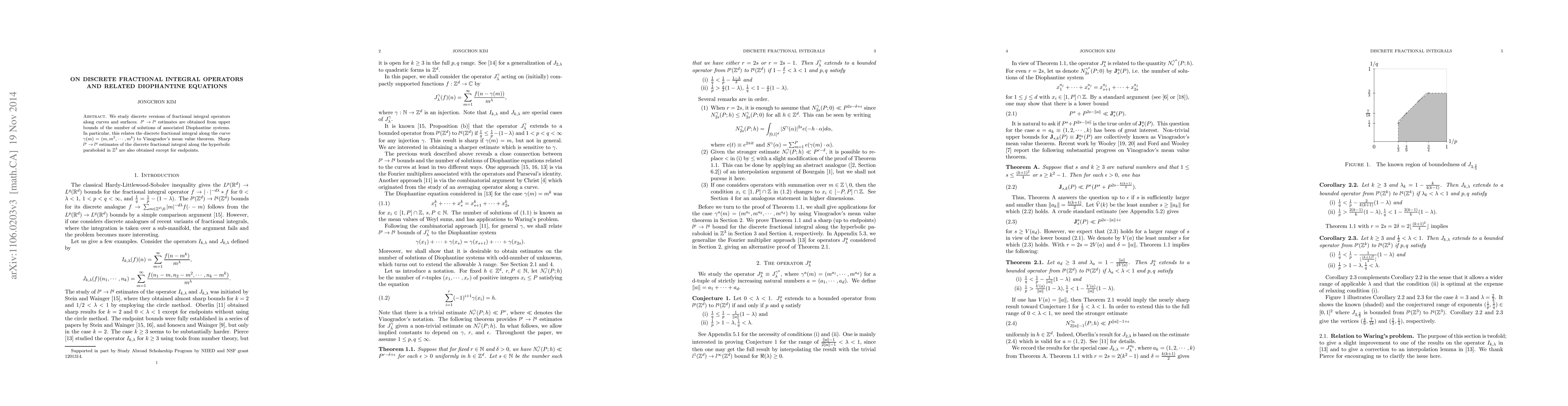This paper explores discrete versions of fractional integral operators on curves and surfaces, deriving $l^p \to l^q$ estimates from the number of solutions to related Diophantine equations. It links these discrete integrals to Vinogradov's mean value theorem and provides sharp estimates for integrals along hyperbolic paraboloid in $\mathbf{Z}^3$, except for the endpoints.