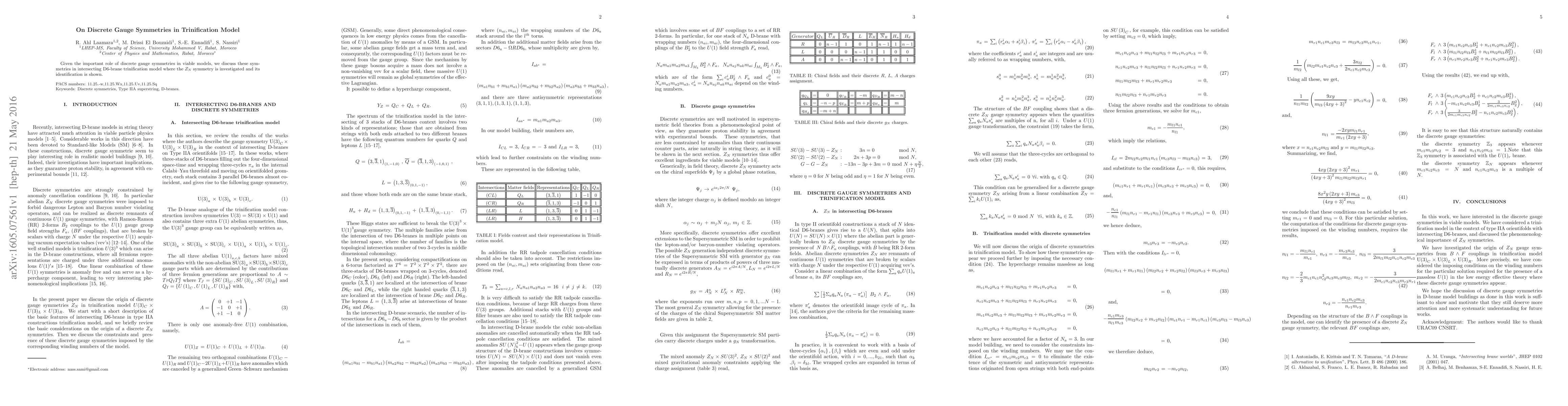 This paper investigates discrete gauge symmetries within the context of an intersecting D6-brane trinification model, focusing on the identification and implications of the ZN symmetry.