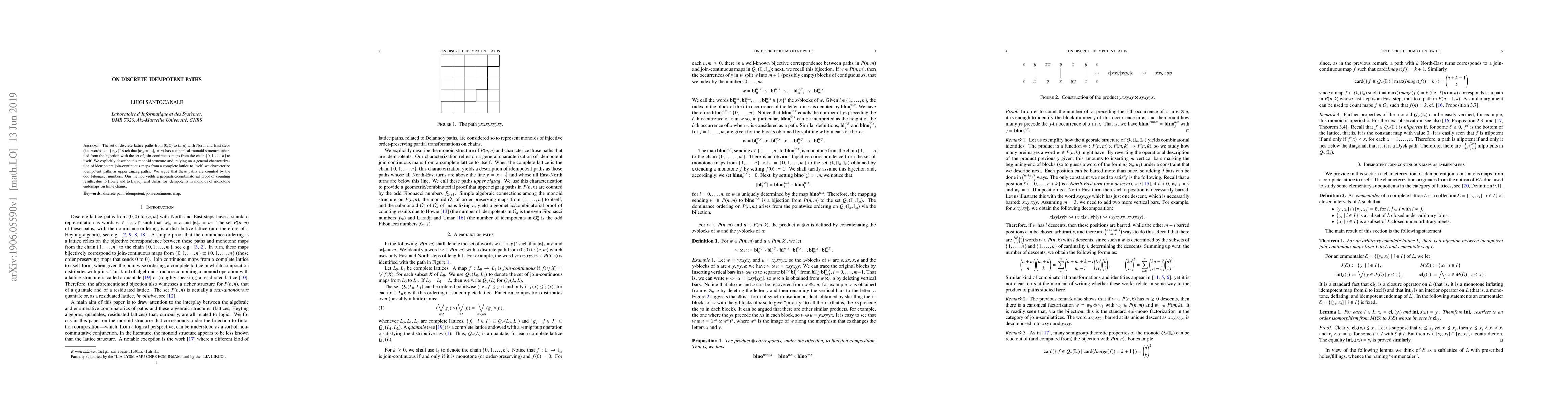 The paper describes the monoid structure of discrete lattice paths from (0, 0) to (n, n) and characterizes idempotent paths as upper zigzag paths, which are counted by odd Fibonacci numbers, providing a combinatorial proof for existing results on idempotents in such monoids.