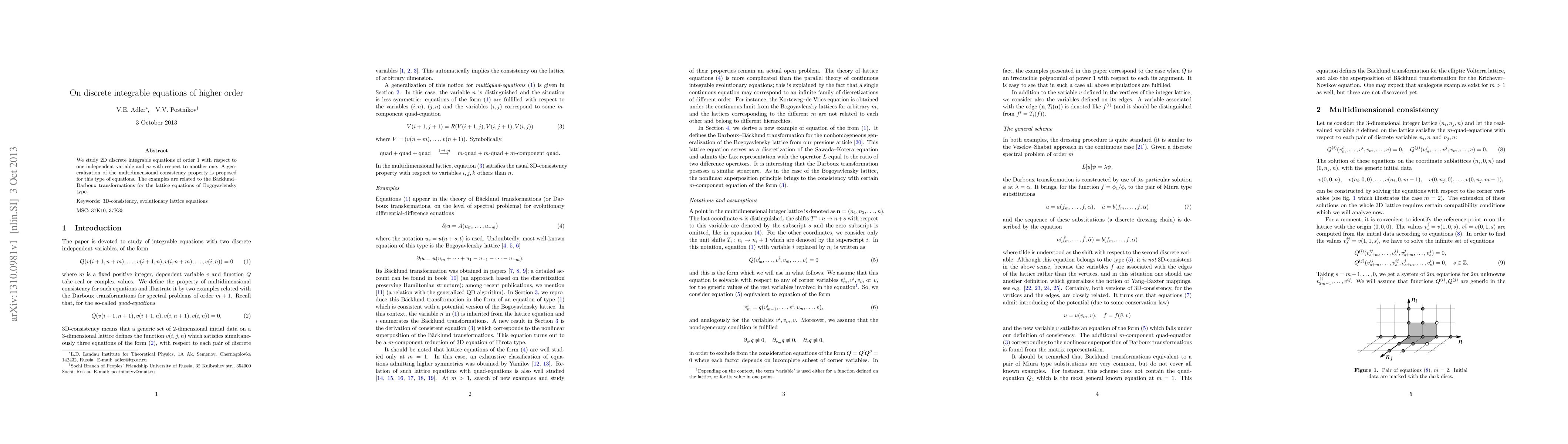 We study 2D discrete integrable equations of order 1 with respect to one independent variable and $m$ with respect to another one. A generalization of the multidimensional consistency property is proposed for this type of equations. The examples are related to the B\"acklund--Darboux transformations for the lattice equations of Bogoyavlensky type.