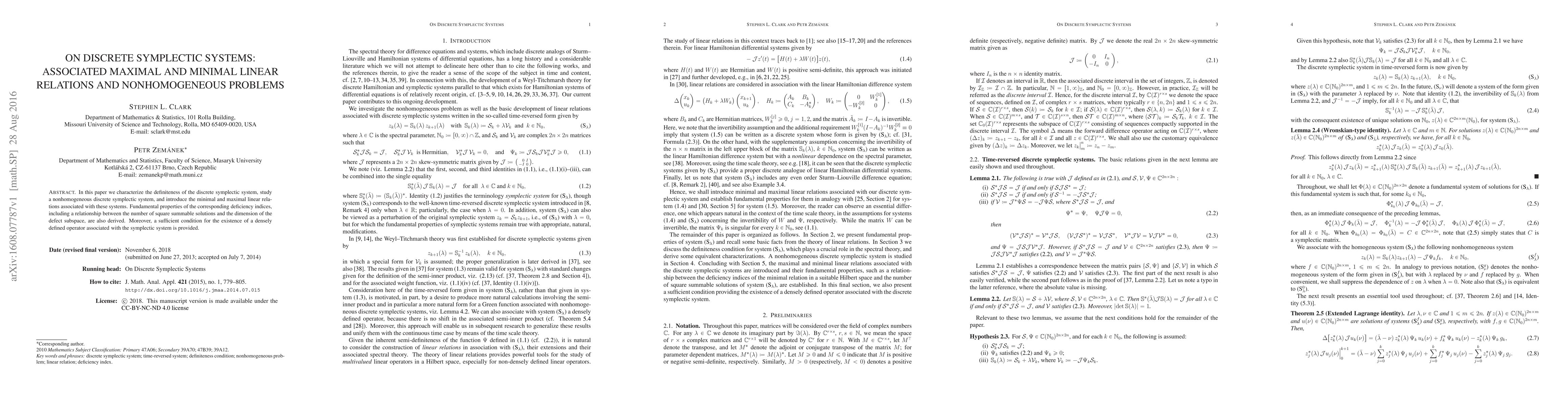 This paper characterizes the definiteness of discrete symplectic systems, explores nonhomogeneous discrete symplectic systems, and introduces minimal and maximal linear relations. It derives fundamental properties of deficiency indices and provides a condition for the existence of a densely defined operator.