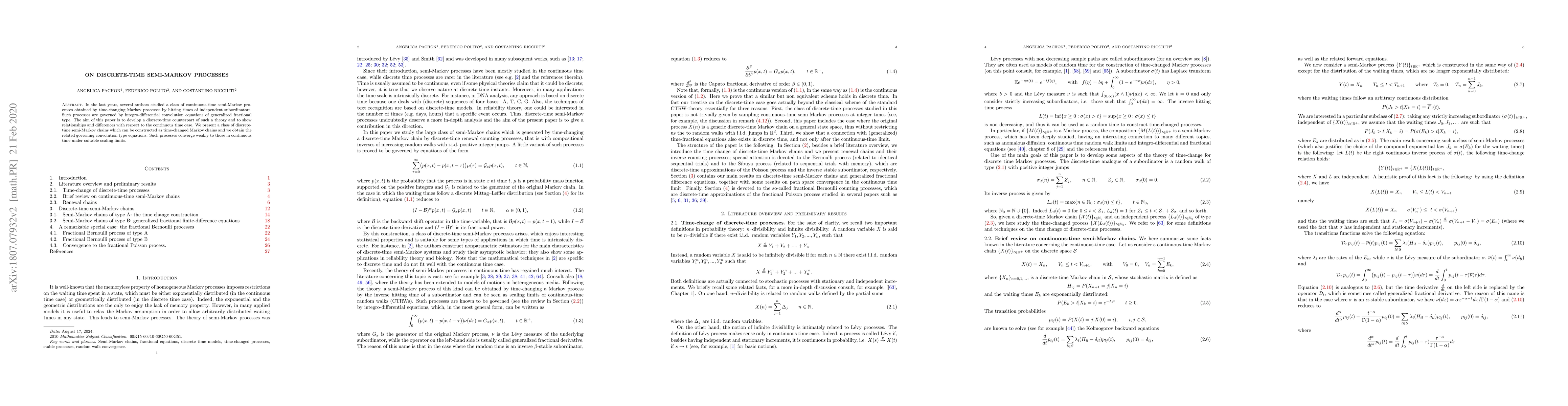 This paper develops the theory for discrete-time semi-Markov processes, showing they can be viewed as time-changed Markov chains. The authors derive governing convolution type equations and demonstrate weak convergence to continuous-time counterparts under appropriate scaling limits.