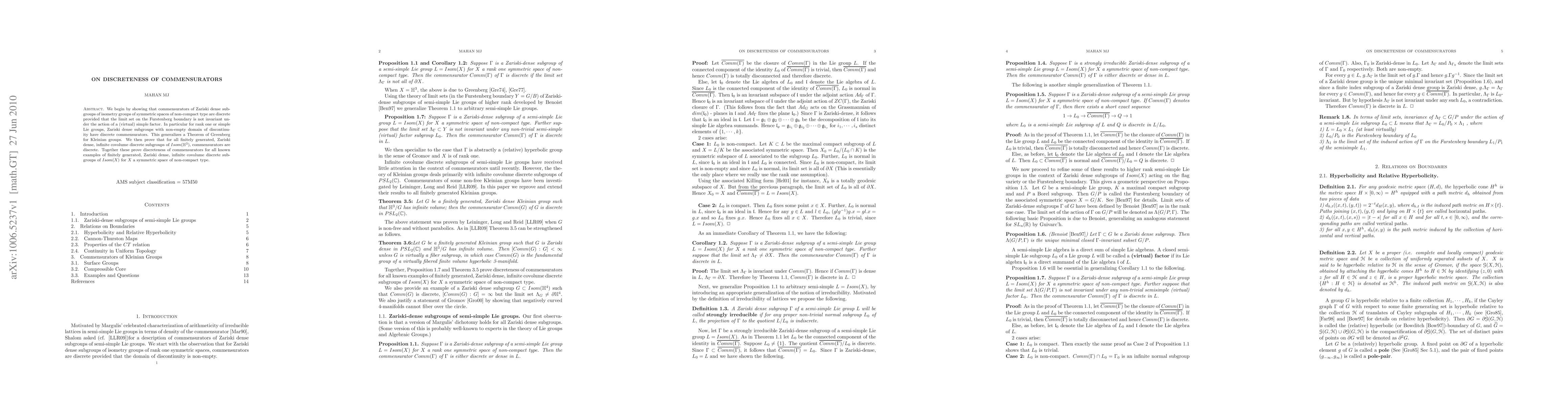 We begin by showing that commensurators of Zariski dense subgroups of isometry groups of symmetric spaces of non-compact type are discrete provided that the limit set on the Furstenberg boundary is not invariant under the action of a (virtual) simple factor. In particular for rank one or simple Lie groups, Zariski dense subgroups with non-empty domain of discontinuity have discrete commensurators. This generalizes a Theorem of Greenberg for Kleinian groups. We then prove that for all finitely generated, Zariski dense, infinite covolume discrete subgroups of $Isom ({\mathbb{H}}^3)$, commensurators are discrete. Together these prove discreteness of commensurators for all known examples of finitely generated, Zariski dense, infinite covolume discrete subgroups of $Isom(X)$ for $X$ a symmetric space of non-compact type.