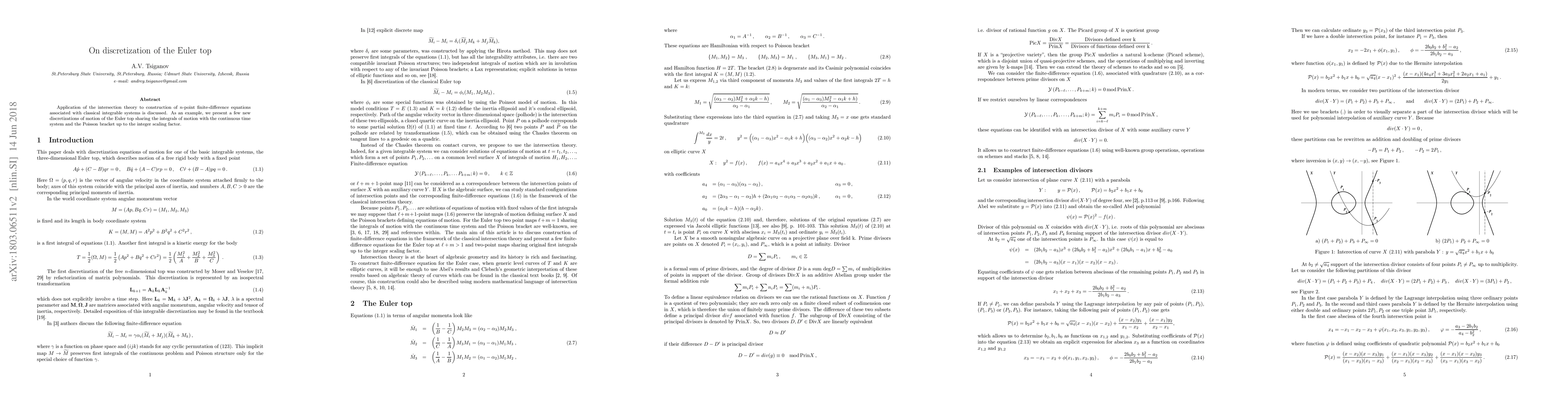 Researchers developed new discretizations for the Euler top system, applying intersection theory to create finite-difference equations that preserve integrals of motion and Poisson brackets.