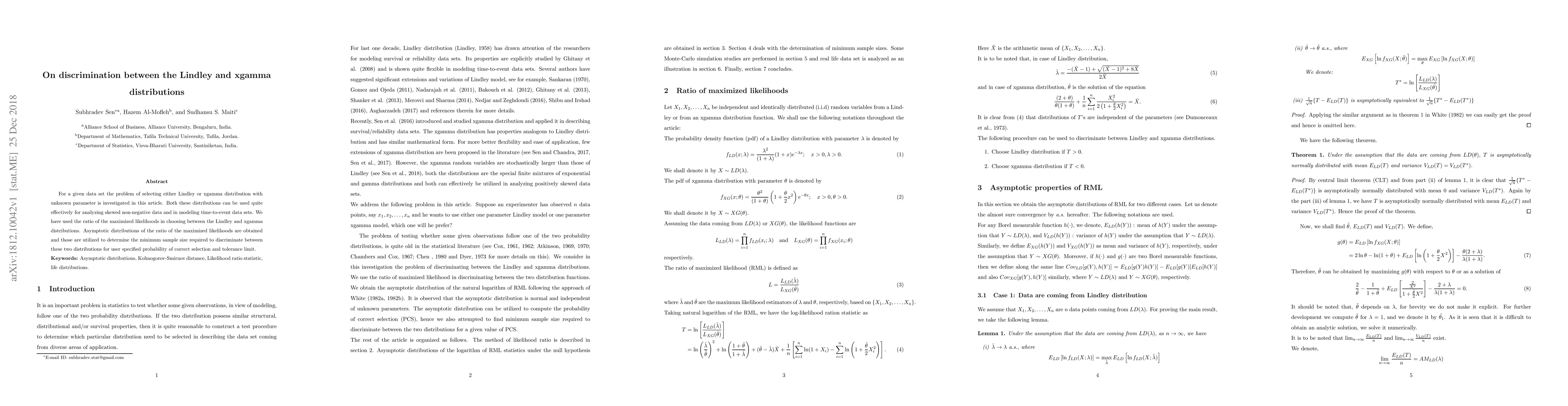 For a given data set the problem of selecting either Lindley or xgamma distribution with unknown parameter is investigated in this article. Both these distributions can be used quite effectively for analyzing skewed non-negative data and in modeling time-to-event data sets. We have used the ratio of the maximized likelihoods in choosing between the Lindley and xgamma distributions. Asymptotic distributions of the ratio of the maximized likelihoods are obtained and those are utilized to determine the minimum sample size required to discriminate between these two distributions for user specified probability of correct selection and tolerance limit.