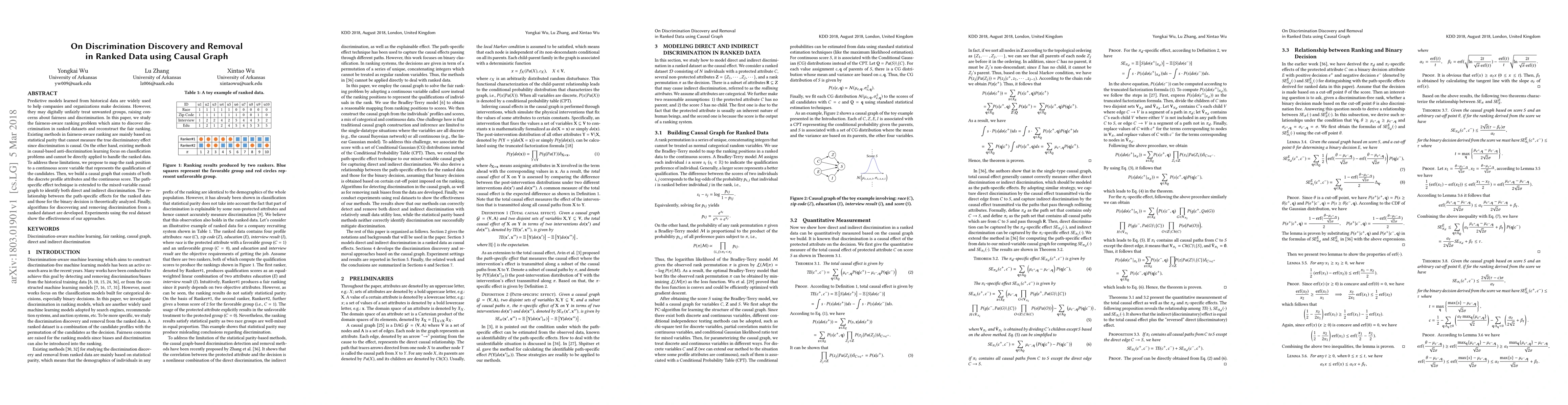 This paper proposes a method for discovering and removing discrimination in ranked datasets by constructing a causal graph that integrates both discrete profile attributes and continuous score variables. It extends the path-specific effect technique to mixed-variable causal graphs to identify direct and indirect discrimination, and develops algorithms to address these issues, demonstrating effectiveness through real dataset experiments.