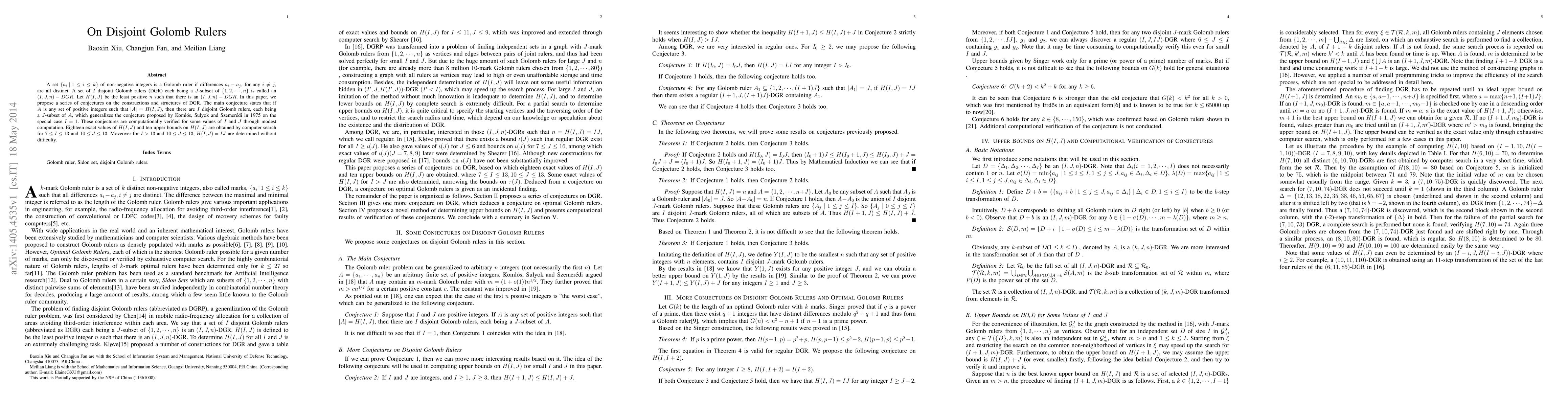 A set $\{a_i\:|\: 1\leq i \leq k\}$ of non-negative integers is a Golomb ruler if differences $a_i-a_j$, for any $i \neq j$, are all distinct. A set of $I$ disjoint Golomb rulers (DGR) each being a $J$-subset of $\{1,2,\cdots, n\}$ is called an $(I,J,n)-DGR$. Let $H(I, J)$ be the least positive $n$ such that there is an $(I,J,n)-DGR$. In this paper, we propose a series of conjectures on the constructions and structures of DGR. The main conjecture states that if $A$ is any set of positive integers such that $|A| = H(I, J)$, then there are $I$ disjoint Golomb rulers, each being a $J$-subset of $A$, which generalizes the conjecture proposed by Koml{\'o}s, Sulyok and Szemer{\'e}di in 1975 on the special case $I = 1$. These conjectures are computationally verified for some values of $I$ and $J$ through modest computation. Eighteen exact values of $H(I,J)$ and ten upper bounds on $H(I,J)$ are obtained by computer search for $7 \leq I \leq 13$ and $10 \leq J \leq 13$. Moveover for $I > 13$ and $10 \leq J \leq 13$, $H(I,J)=IJ$ are determined without difficulty.