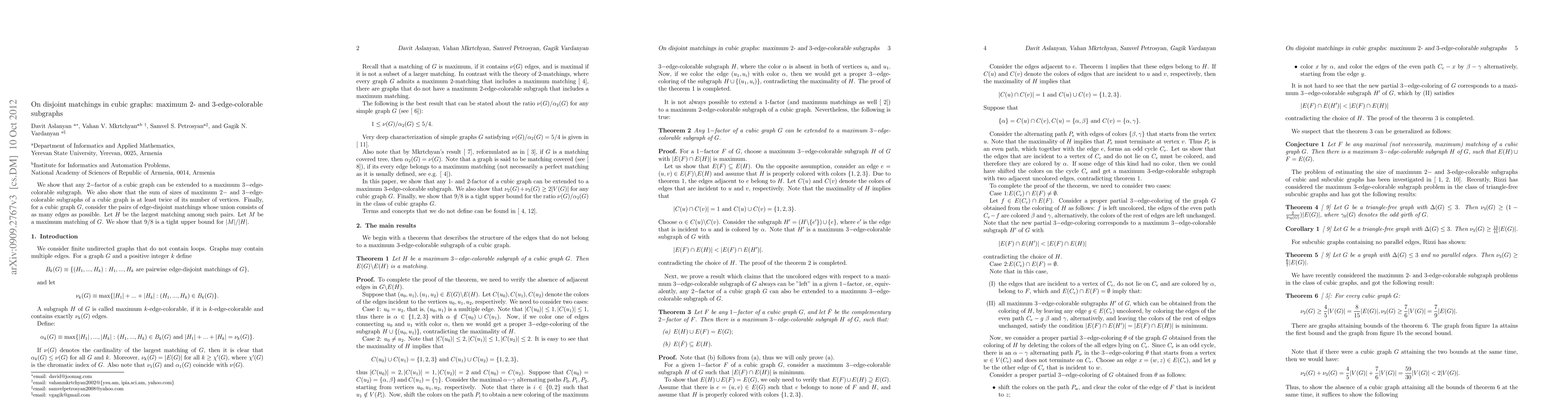 This paper demonstrates that any 2-factor in a cubic graph can be extended to a maximum 3-edge-colorable subgraph. It also proves that the combined sizes of the largest 2- and 3-edge-colorable subgraphs in a cubic graph is at least double the number of vertices, and establishes a tight upper bound of 9/8 for the ratio of a maximum matching to the largest matching in a set of edge-disjoint matchings.