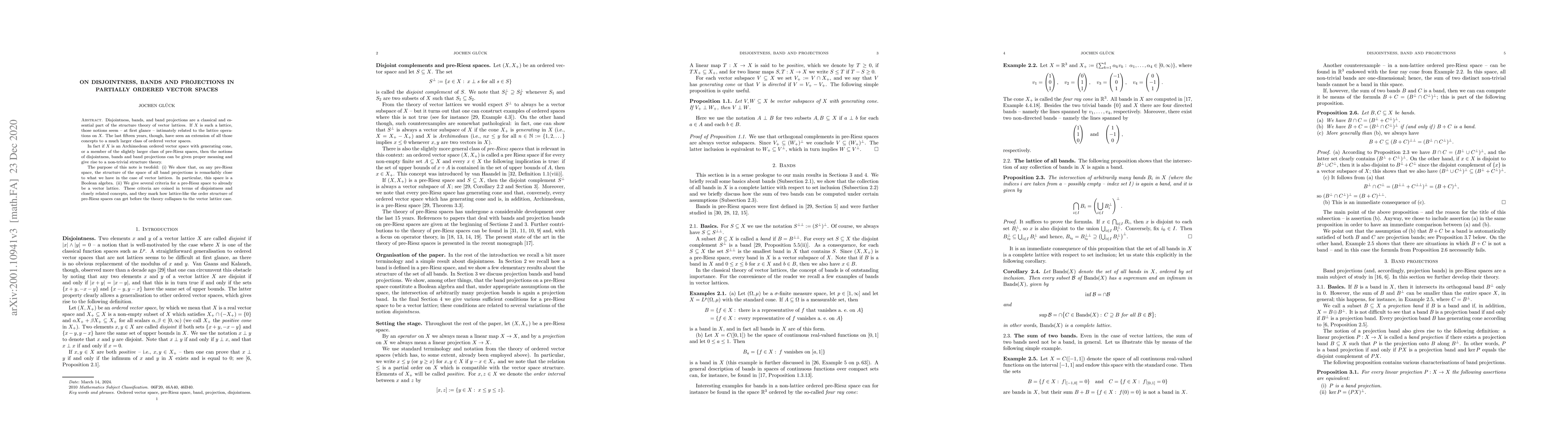 Disjointness, bands, and band projections are a classical and essential part of the structure theory of vector lattices. If $X$ is such a lattice, those notions seem - at first glance - intimately related to the lattice operations on $X$. The last fifteen years, though, have seen an extension of all those concepts to a much larger class of ordered vector spaces. In fact if $X$ is an Archimedean ordered vector space with generating cone, or a member of the slightly larger class of pre-Riesz spaces, then the notions of disjointness, bands and band projections can be given proper meaning and give rise to a non-trivial structure theory. The purpose of this note is twofold: (i) We show that, on any pre-Riesz space, the structure of the space of all band projections is remarkably close to what we have in the case of vector lattices. In particular, this space is a Boolean algebra. (ii) We give several criteria for a pre-Riesz space to already be a vector lattice. These criteria are coined in terms of disjointness and closely related concepts, and they mark how lattice-like the order structure of pre-Riesz spaces can get before the theory collapses to the vector lattice case.