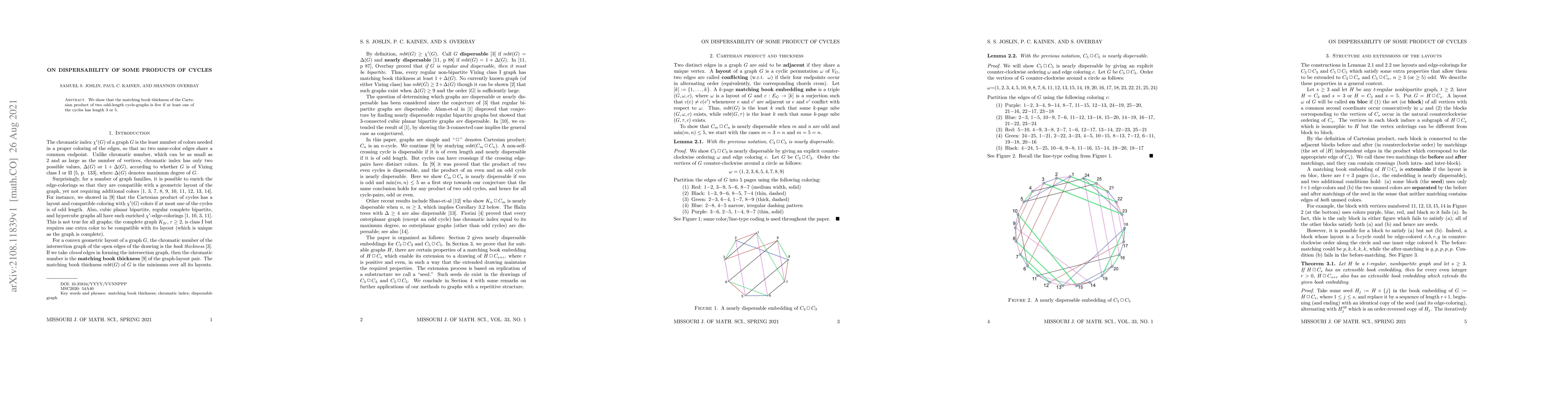 We show that the matching book thickness of the Cartesian product of two odd-length cycle-graphs is five if at least one of the cycles has length 3 or 5.