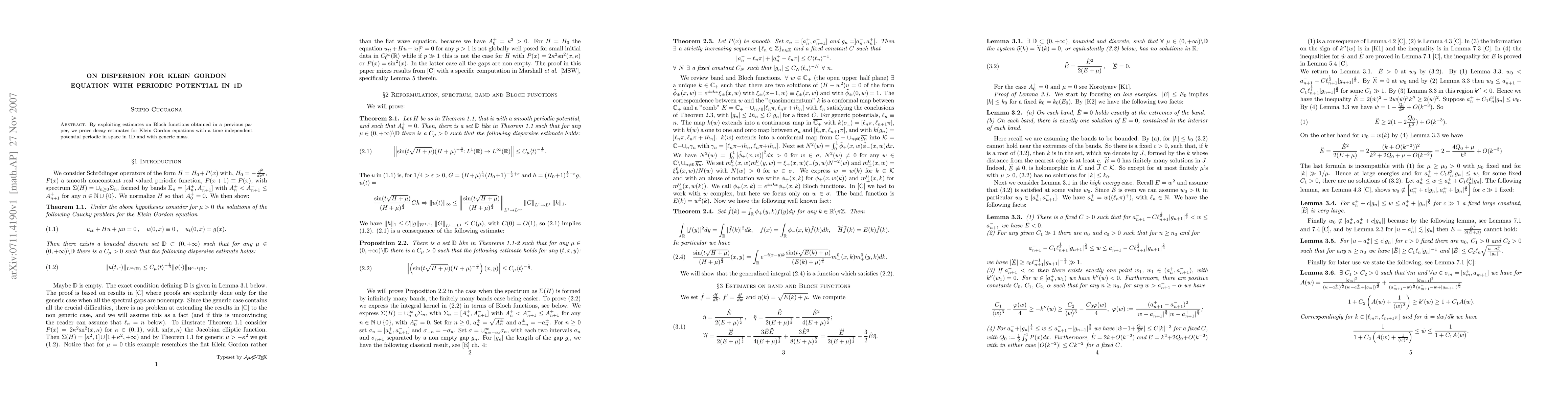 By exploiting estimates on Bloch functions obtained in a previous paper, we prove decay estimates for Klein Gordon equations with a time independent potential periodic in space in 1D and with generic mass