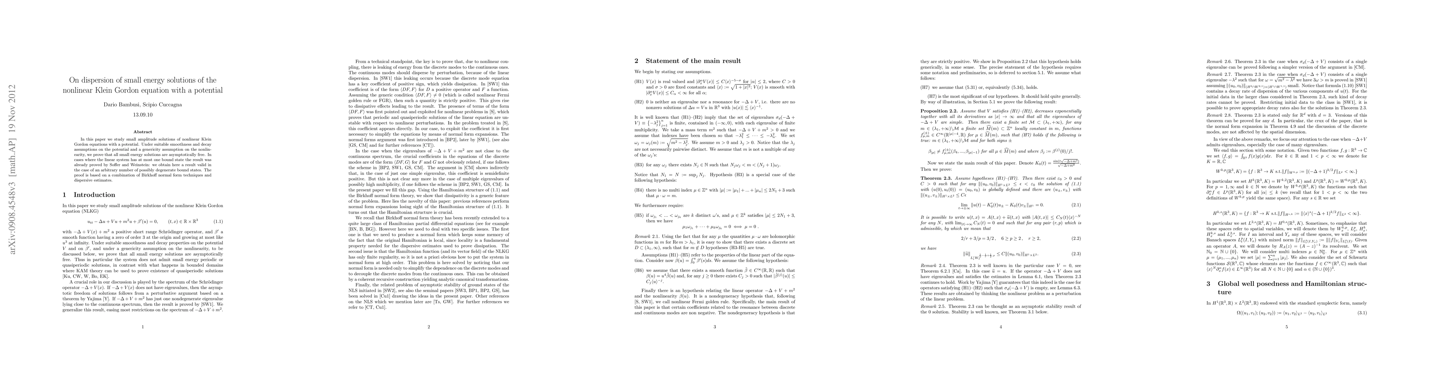 In this paper we study small amplitude solutions of nonlinear Klein Gordon equations with a potential. Under smoothness and decay assumptions on the potential and a genericity assumption on the nonlinearity, we prove that all small amplitude initial data with finite energy give rise to solutions asymptotically free. In the case where the linear system has at most one bound state the result was already proved by Soffer and Weinstein: we obtain here a result valid in the case of an arbitrary number of possibly degenerate bound states. The proof is based on a combination of Birkhoff normal form techniques and dispersive estimates.