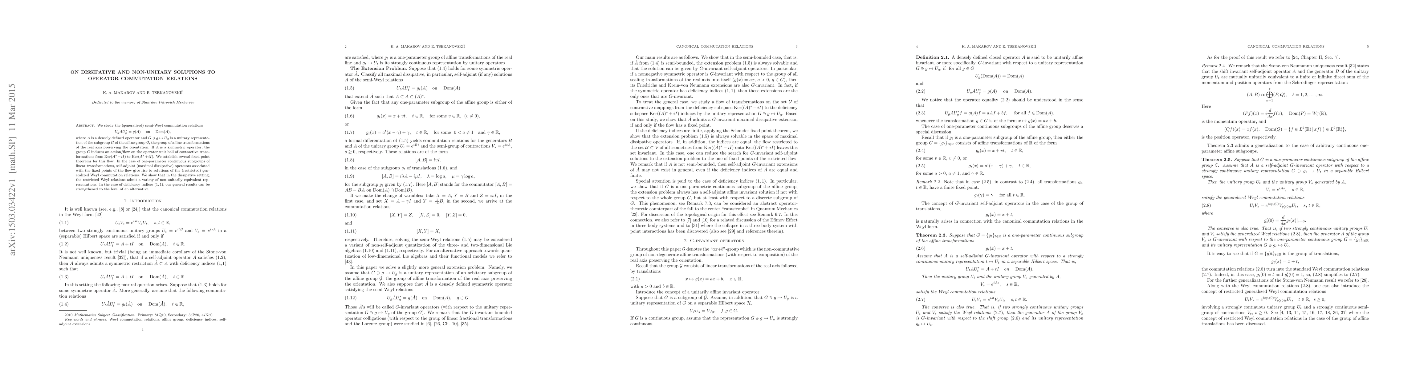We study the (generalized) semi-Weyl commutation relations $$ U_gAU_g^*=g(A) \quad \text{ on }\quad \Dom(A), $$ where $A$ is a densely defined operator and $G\ni g\mapsto U_g$ is a unitary representation of the subgroup $G$ of the affine group $\cG$, the group of affine transformations of the real axis preserving the orientation. If $A$ is a symmetric operator, the group $G$ induces an action/flow on the operator unit ball of contractive transformations from $\Ker (A^*-iI)$ to $\Ker (A^*+iI)$. We establish several fixed point theorems for this flow. In the case of one-parameter continuous subgroups of linear transformations, self-adjoint (maximal dissipative) operators associated with the fixed points of the flow give rise to solutions of the (restricted) generalized Weyl commutation relations. We show that in the dissipative setting, the restricted Weyl relations admit a variety of non-unitarily equivalent representations. In the case of deficiency indices $(1,1)$, our general results can be strengthened to the level of an alternative.