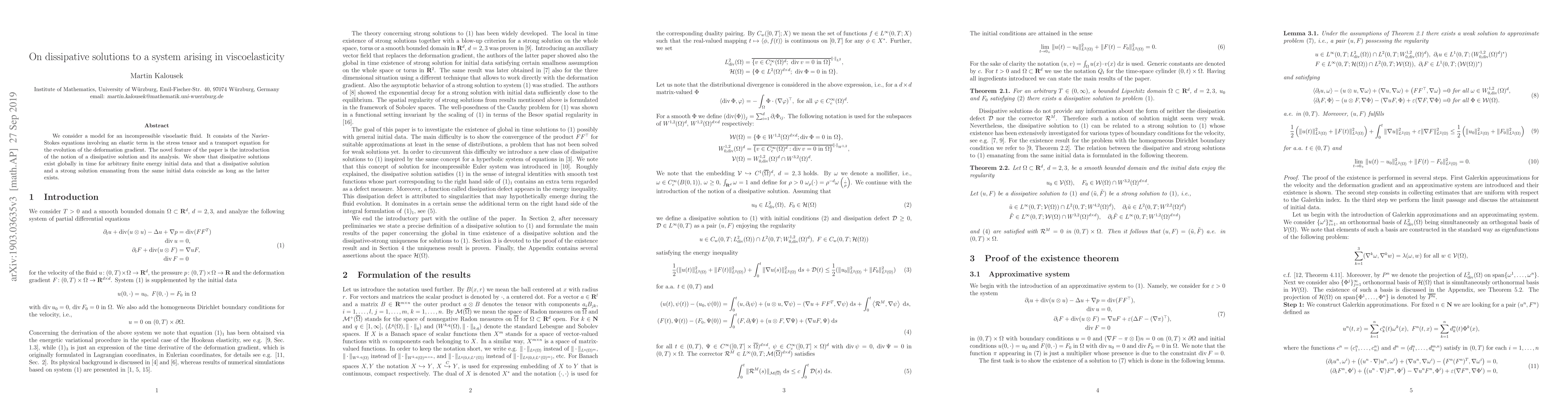 We consider a model for an incompressible visoelastic fluid. It consists of the Navier-Stokes equations involving an elastic term in the stress tensor and a transport equation for the evolution of the deformation gradient. The novel feature of the paper is the introduction of the notion of a dissipative solution and its analysis. We show that dissipative solutions exist globally in time for arbitrary finite energy initial data and that a dissipative solution and a strong solution emanating from the same initial data coincide as long as the latter exists.