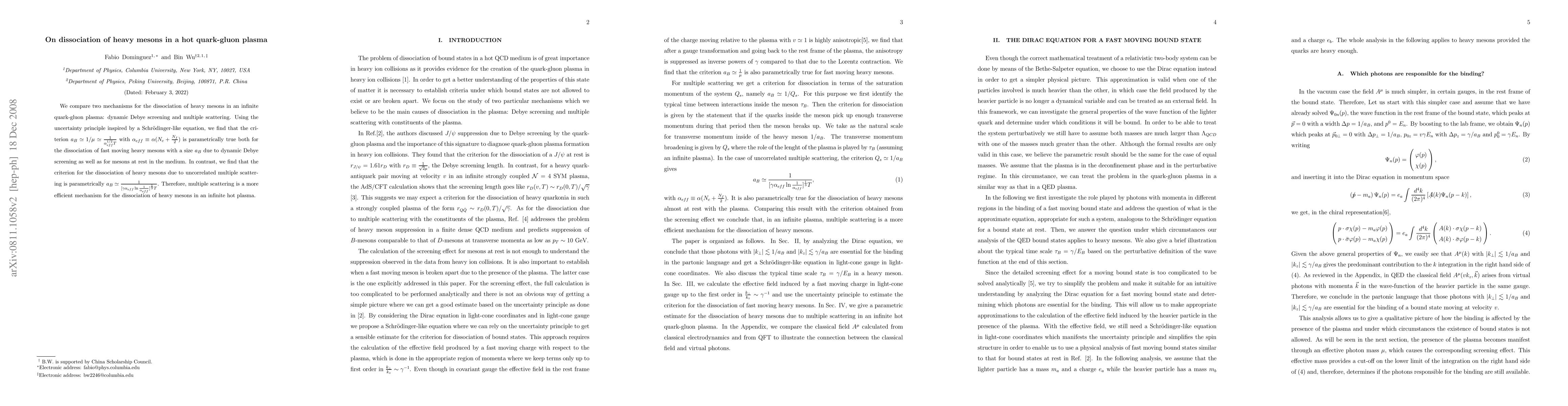 We compare two mechanisms for the dissociation of heavy mesons in an infinite quark-gluon plasma: dynamic Debye screening and multiple scattering. Using the uncertainty principle inspired by a Schrodinger-like equation, we find that the criterion a_B\simeq1/\mu\simeq 1/(\alpha_{eff}^{1/2}T) with \alpha_{eff}\equiv\alpha(N_c+{N_f\over2}) is parametrically true both for the dissociation of fast moving heavy mesons with a size a_B due to dynamic Debye screening as well as for mesons at rest in the medium. In contrast, we find that the criterion for the dissociation of heavy mesons due to uncorrelated multiple scattering is parametrically 1/a_B \simeq [\gamma\alpha_{eff}\ln{1/\alpha_{eff}}]^{1/3}T. Therefore, multiple scattering is a more efficient mechanism for the dissociation of heavy mesons in an infinite hot plasma.